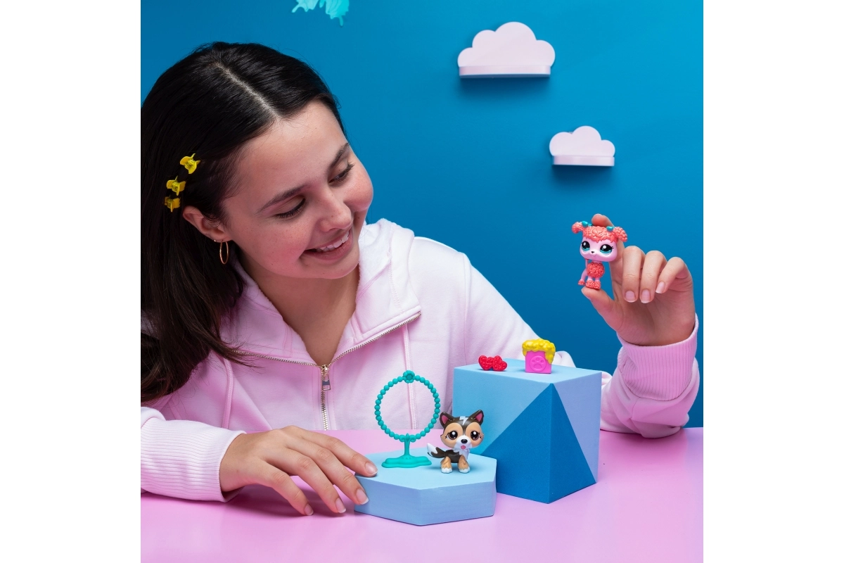Sada Jump n’ Joy přináší roztomilá štěňátka a modrý kruh pro skákání. Trénujte triky, tvořte scénky a vystavujte mazlíčky díky stabilním podstavcům.