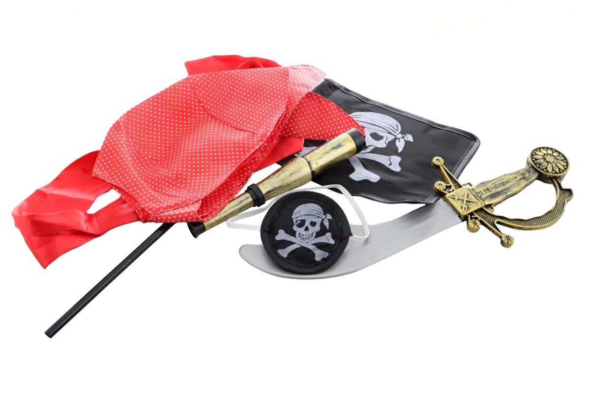 - Plášť, šortky, šavle, pirátská vlajka, šátek na hlavu, pásek, páska na oko