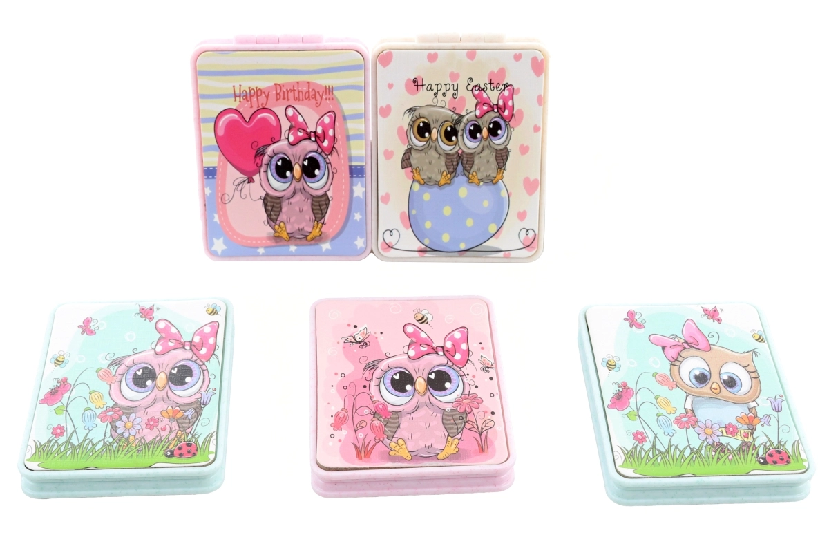 Užijte si šikovné a stylové kapesní zrcátko se sovičkami, které se vejde do každé kabelky. Díky kompaktním rozměrům a lehkému plastovému tělu je ideální na cesty, do školy i do práce. Různé roztomilé motivy soviček potěší děti i dospělé.