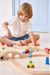 Masivní dřevěná konstrukce a pevné díly vydrží každodenní hraní. Ideální doplněk herních setů s vláčky, autíčky i dopravními značkami.