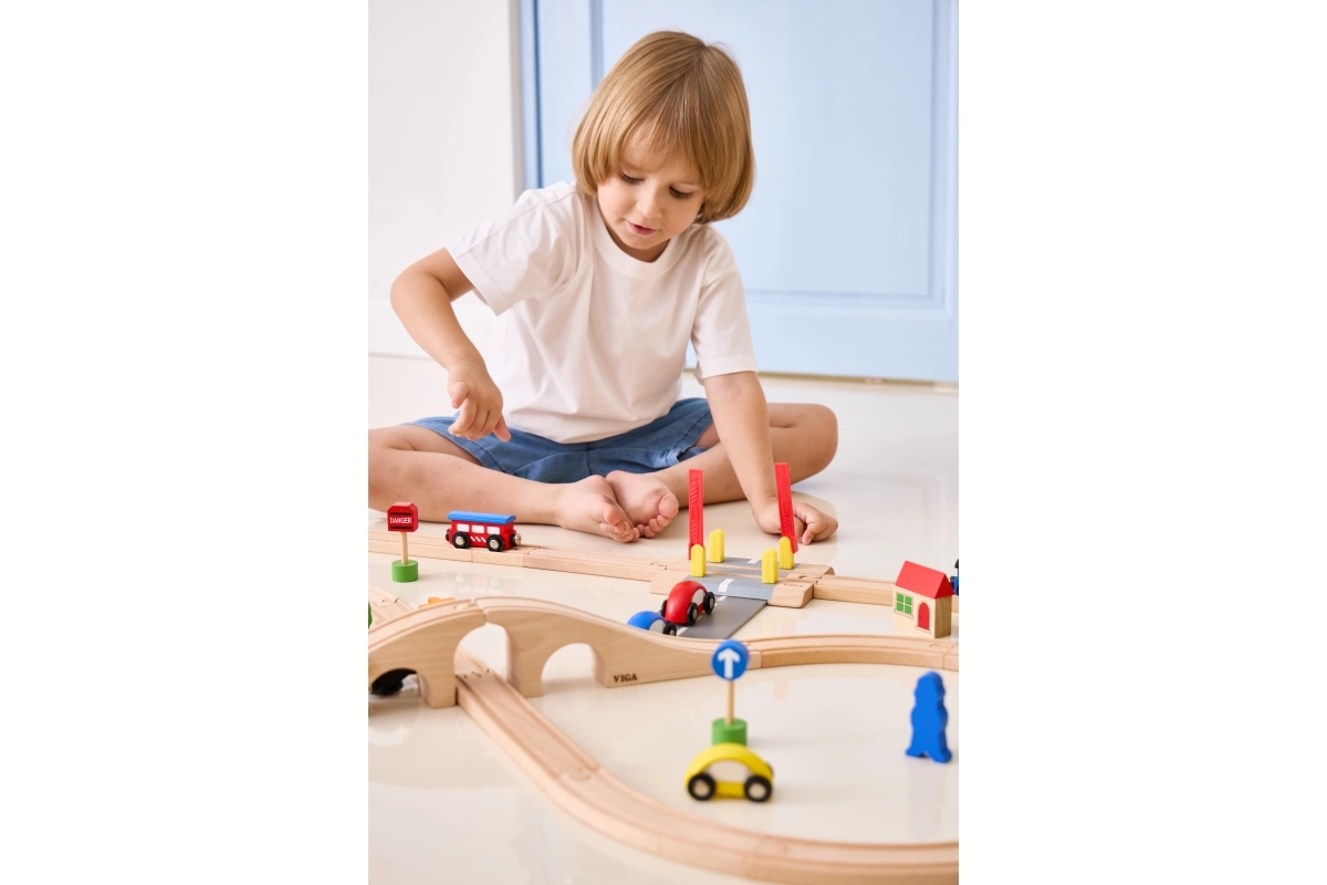 Propojovací koncovky pasují k běžným dřevěným systémům kolejí a silnic, takže přejezd snadno zapojíte do stávající stavebnice.
