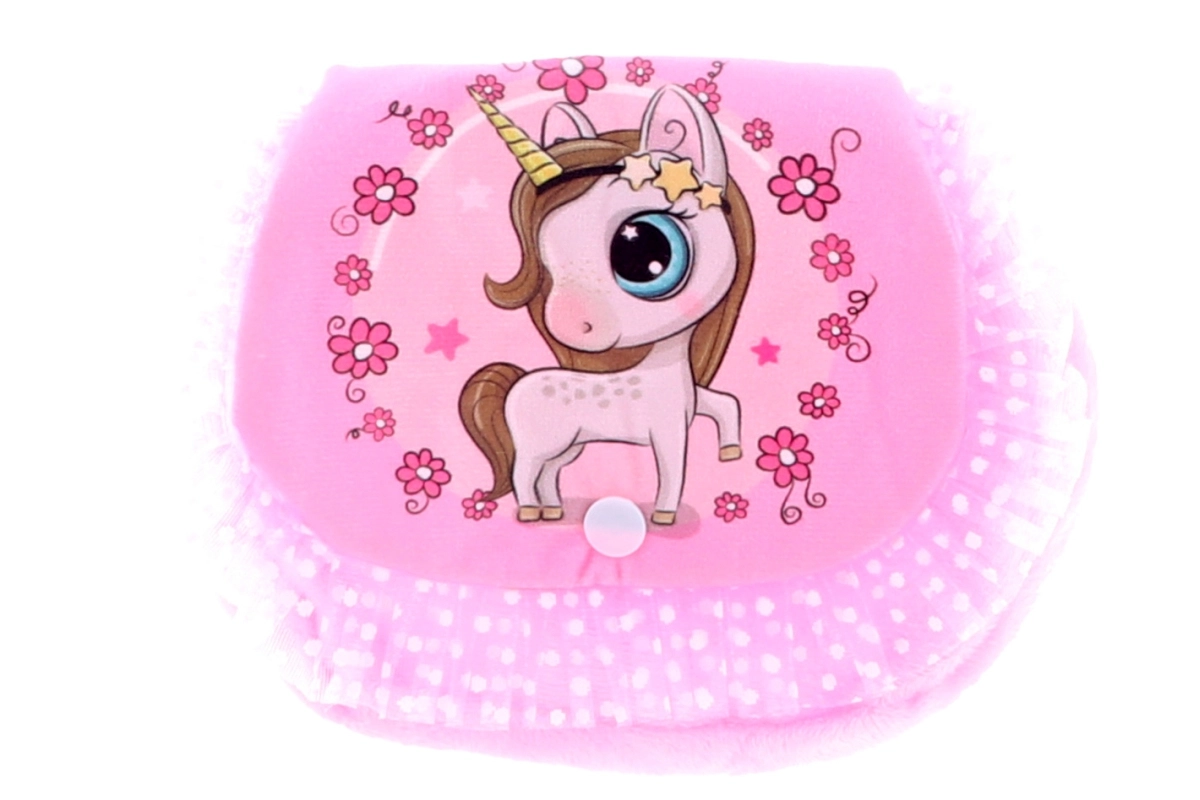 Tato stylová dětská kabelka s motivem jednorožce zaujme na první pohled. Jemný plyšový materiál je příjemný na dotek a kompaktní velikost je perfektní pro klíče, kapesníčky, drobnou peněženku či malé poklady. Díky nastavitelnému popruhu lze kabelku pohodlně nosit přes rameno.