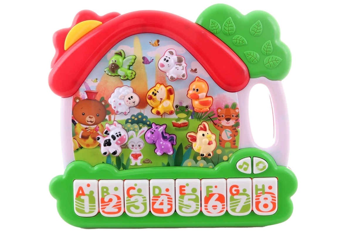 Zábavné dětské piánko ve tvaru domečku potěší malé muzikanty od 3 let. Nabízí 8 tlačítek se zvuky zvířátek a 8 číselných tlačítek s anglickou výslovností, takže rozvíjí hudební sluch i jazykové dovednosti. Lehké plastové provedení, snadné ovládání a kompaktní rozměry pro hraní doma i na cestách.