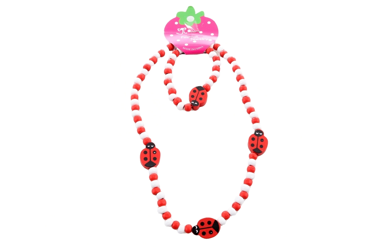 Rozkošná sada doplňků pro malé parádnice s motivem berušek. Obsahuje náhrdelník a náramek z dřevěných korálků navlečených na pružné gumičce, díky které jsou pohodlné a přizpůsobivé. Ideální pro každodenní nošení i jako milý dárek.