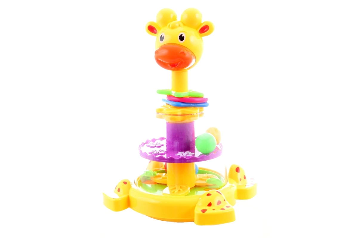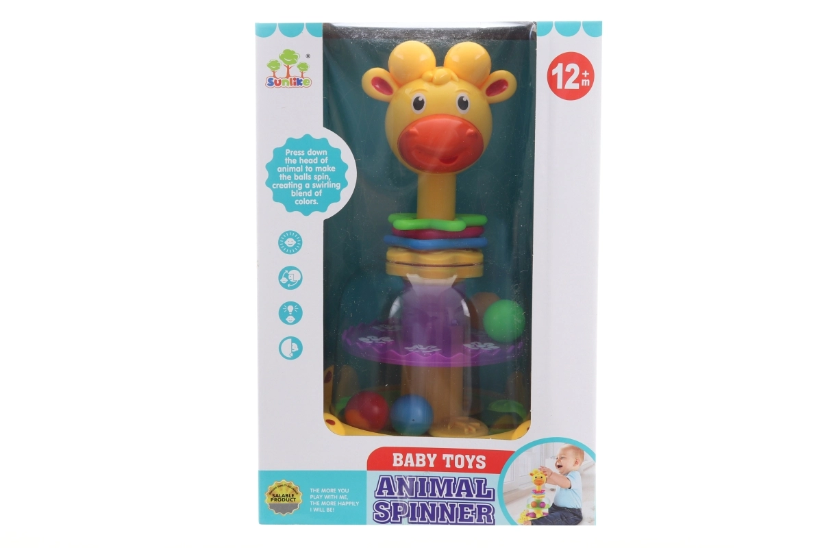 Intuitivní mechanismus: jemným zatlačením na hlavu žirafky se roztočí barevné kuličky a kroužky uvnitř průhledné komory.