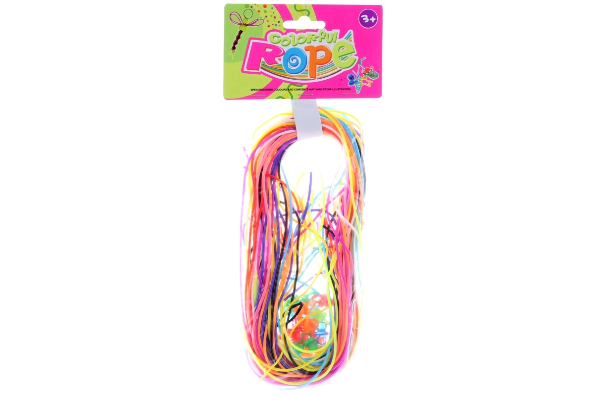Obsah balení zahrnuje gumové struny pro splétání a plastové doplňky ve tvaru dudlíků, které dodají výrobkům hravý vzhled. Sada je lehká a skladná, balená v sáčku – ideální na cesty i domácí tvoření.