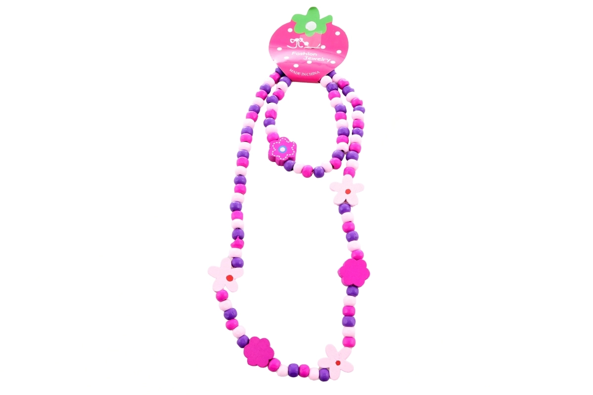Roztomilá sada doplňků pro malé parádnice zahrnuje náhrdelník a náramek z dřevěných korálků s motivem kytiček. Díky pružné gumičce jsou šperky pohodlné a přizpůsobivé, snadno se nasazují a dobře drží. Ideální pro každodenní nošení i jako malý dárek.