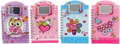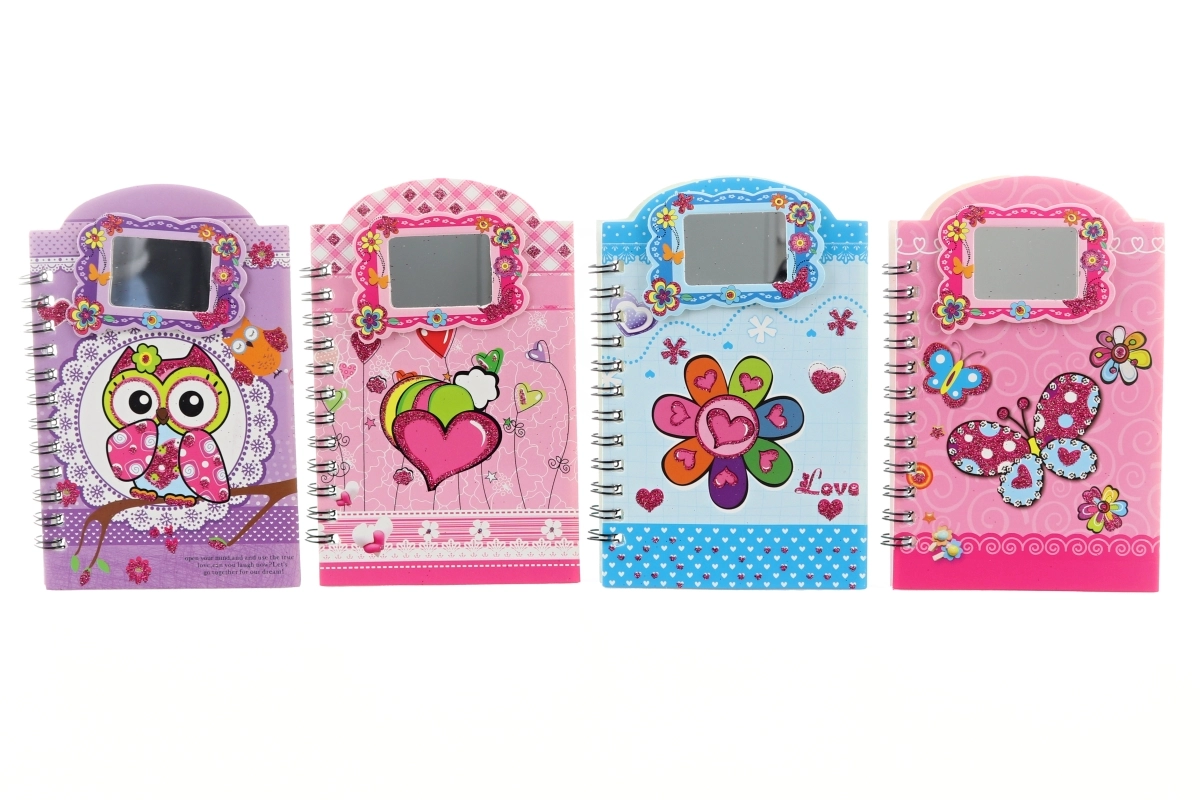 Tento stylový dívčí zápisník je skvělým společníkem pro poznámky, deníkové zápisky i drobné nápady. Ozdobné motivy srdíček, soviček, květin či motýlů a praktické zrcátko na obálce z něj dělají originální doplněk pro každý den.