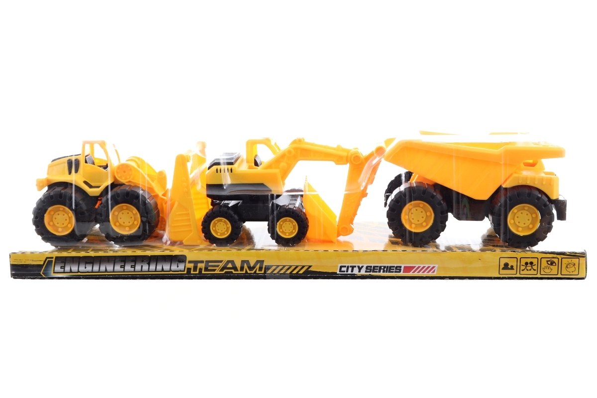 Zábavná sada stavebních strojů pro malé stavitele od 3 let. Vozidla mají kola na volný běh, jsou vyrobená z odolného plastového materiálu a skvěle padnou do dětské ruky.