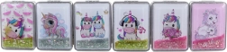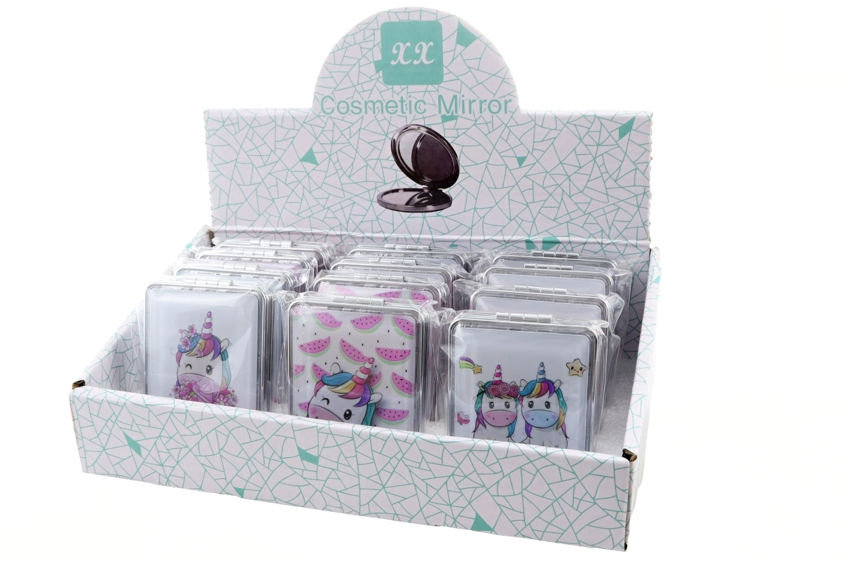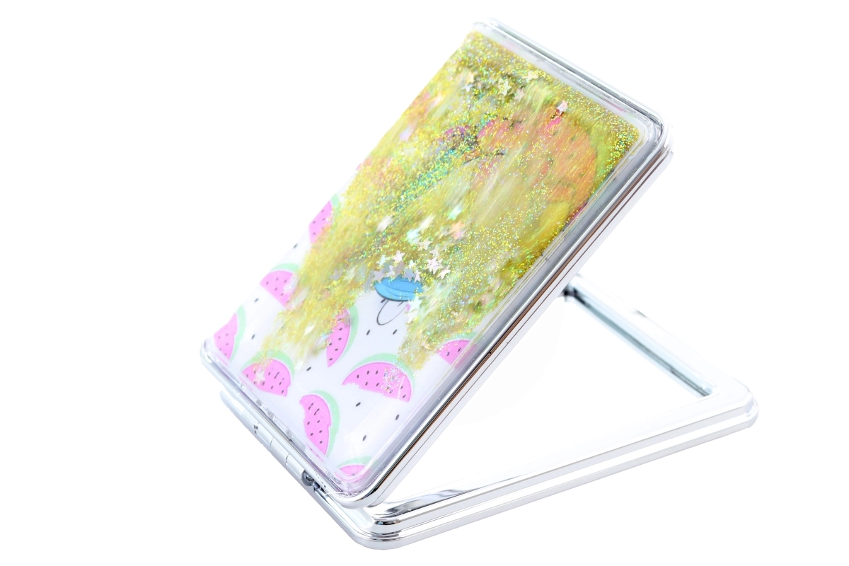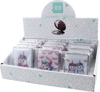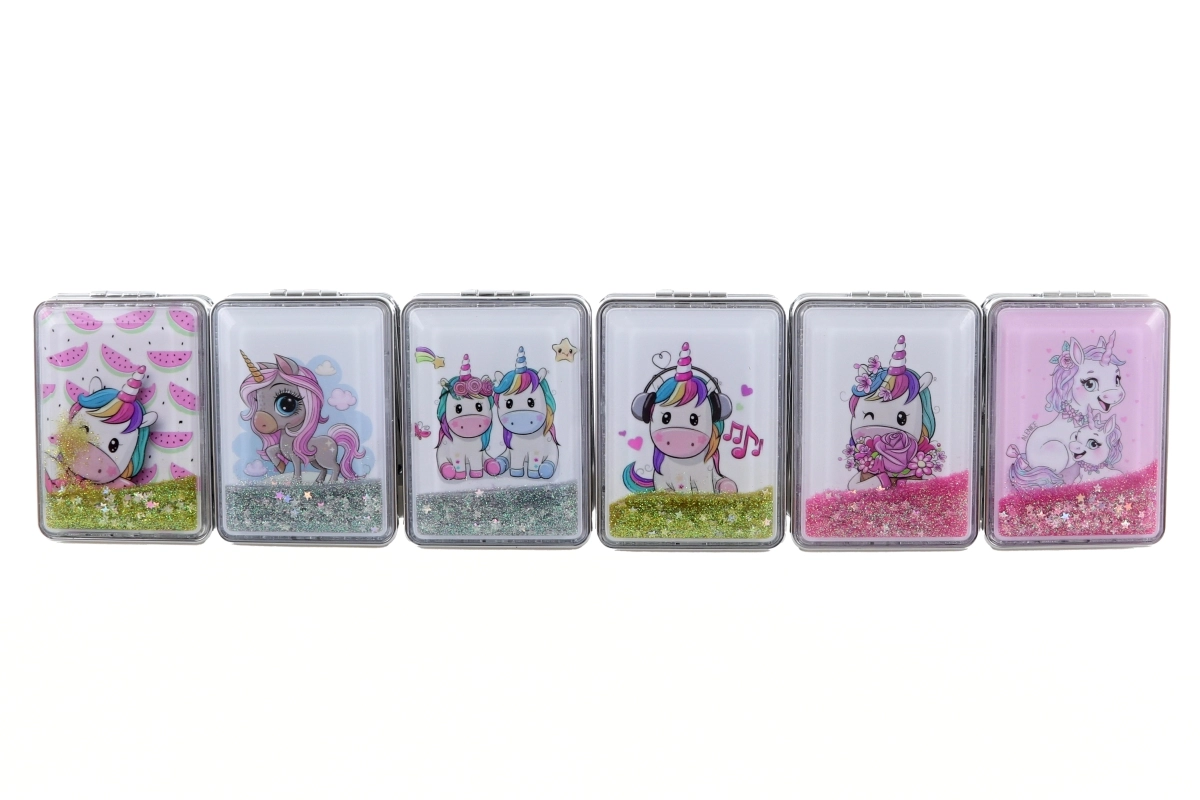 Udělejte si radost roztomilým a praktickým doplňkem do kabelky. Hranaté kapesní zrcátko s motivem jednorožců zaujme přesýpacími třpytkami na přední straně a nabídne dvě zrcadlové plochy po otevření. Ideální pro rychlé úpravy make-upu na cestách.