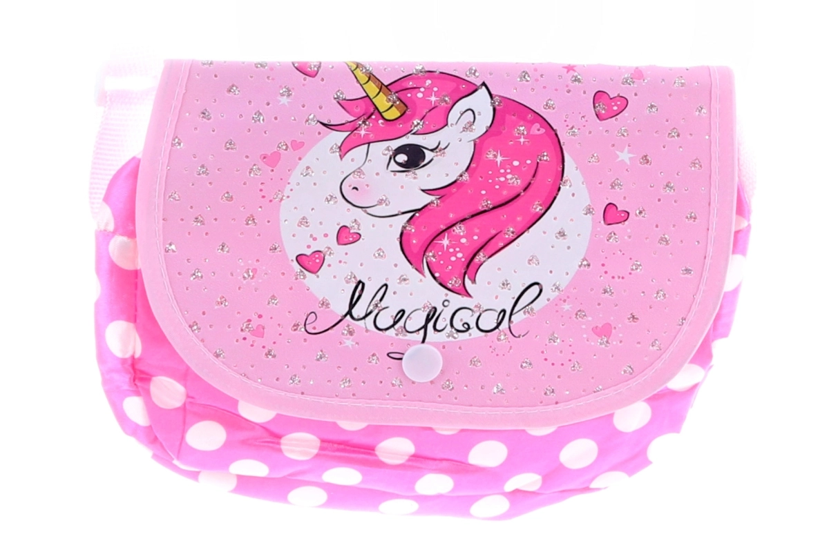 Tato lehká látková kabelka s motivem jednorožce je ideální pro každodenní nošení do města, do školy i na volný čas. Díky kompaktním rozměrům se pohodlně nosí a přitom pojme všechny nezbytnosti. Bezpečné zapínání na zip chrání obsah a delší popruh umožní nosit kabelku křížem přes tělo i klasicky přes rameno.