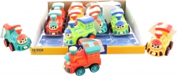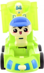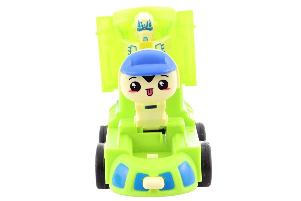 Zábavná plastová mašinka na setrvačník, která se po stisknutí tlačítka promění v robota. Kompaktní rozměry 10 × 7 × 7 cm, čtyři barevné varianty dle dostupnosti a bezpečné provedení pro děti od 3 let.