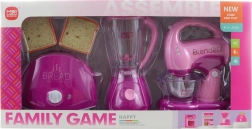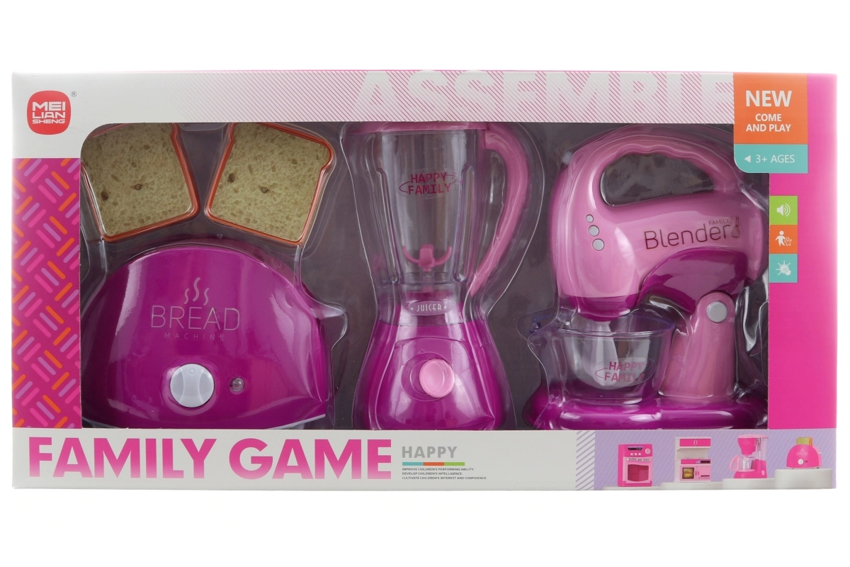 Tato barevná sada domácích spotřebičů přináší dětem autentický zážitek z vaření. Toustovač po zapnutí svítí, vydává zvuky a po chvíli vystřelí tousty. Mixér má průhlednou nádobu, svítí a točí se, stejně jako šlehač, který navíc realisticky roztáčí metly. Vše je uzpůsobeno bezpečné dětské hře.