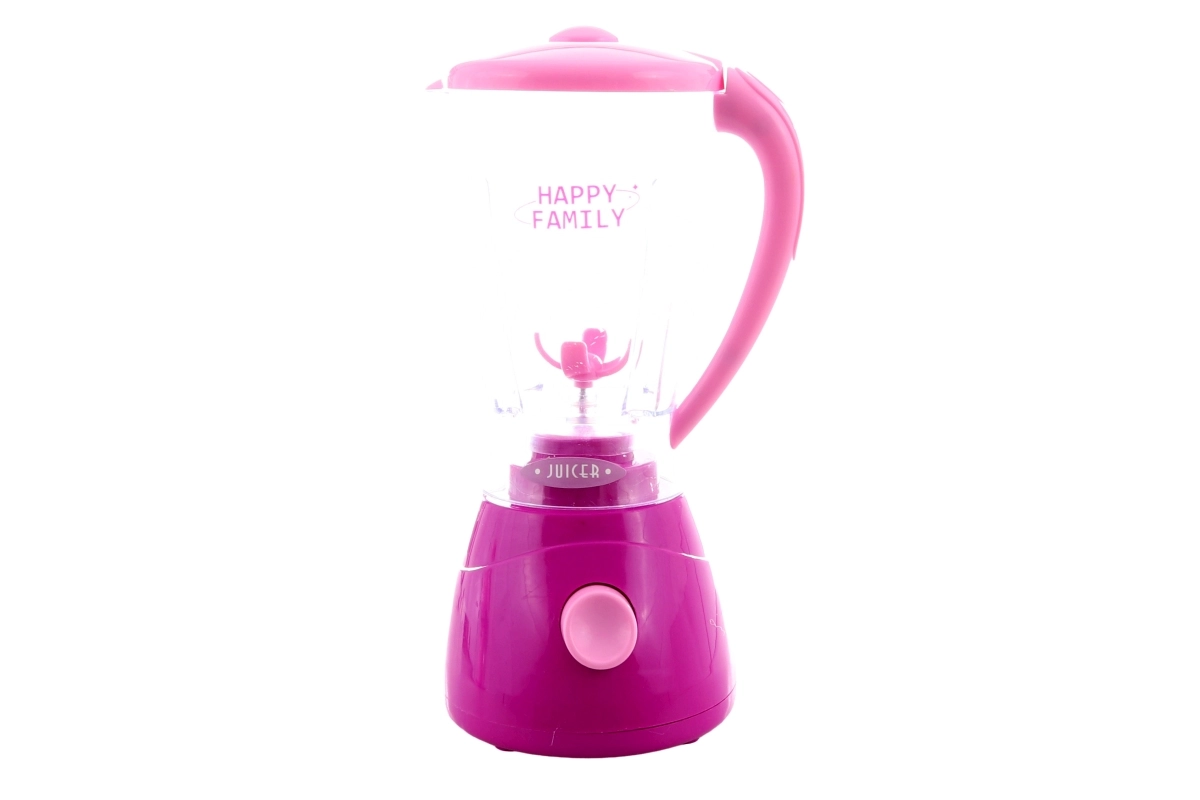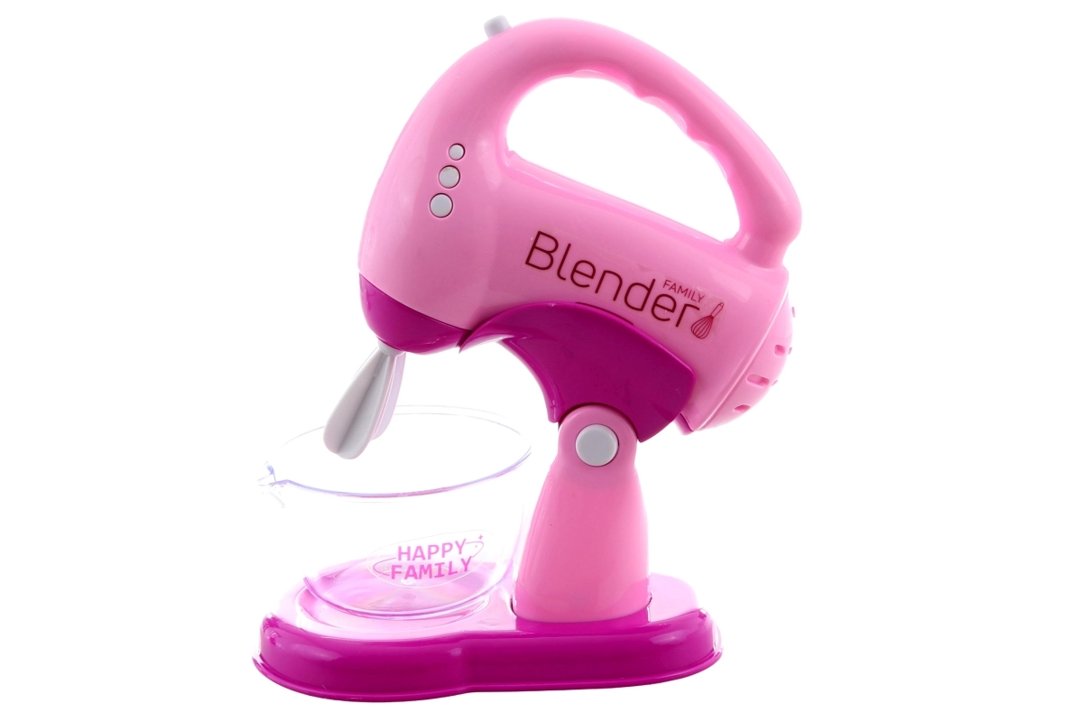 Růžový mixér s jedním tlačítkem, průhledným džbánem a viditelnou „čepelí“ se při hře roztočí a svítí.