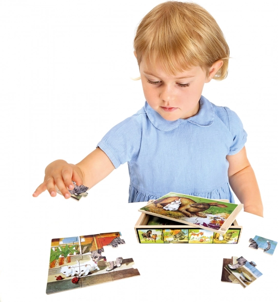 Objevte kouzlo tradičních dřevěných puzzle, které představují motivy jako kočka, pejsek, koně a králíci. Sada obsahuje 48 dílků, které jsou baleny v praktické krabičce s víkem, což usnadňuje jejich ukládání a přenášení.