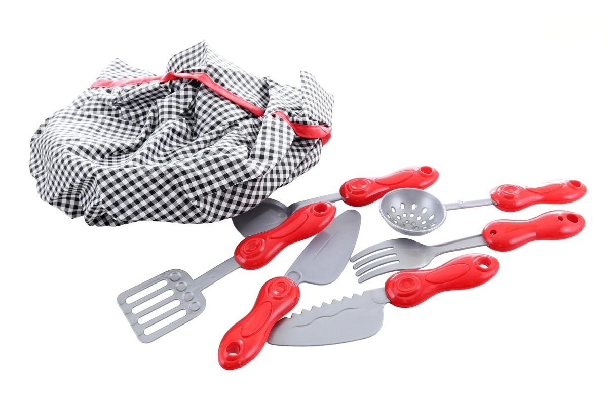 Kompletní výbava zahrnuje kabátek, čepici, rukavici a sadu kuchyňských nástrojů – okamžitě připraveno ke hře na vaření.
