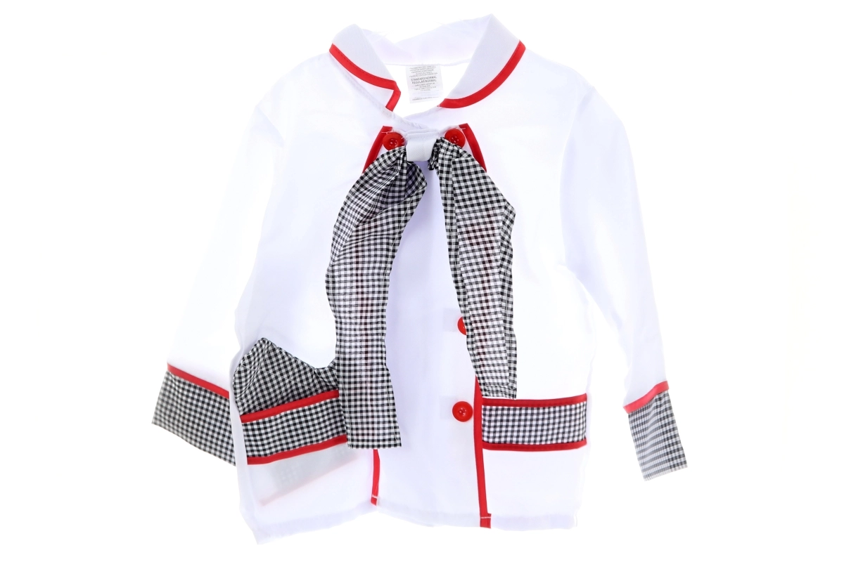 Dětský kostým kuchaře rozvíjí fantazii, kreativitu i jemnou motoriku. Set zahrnuje vše potřebné pro realistickou hru na vaření – od stylového kabátku s knoflíky po praktické doplňky včetně kuchyňské rukavice, čepice a plastového náčiní.