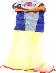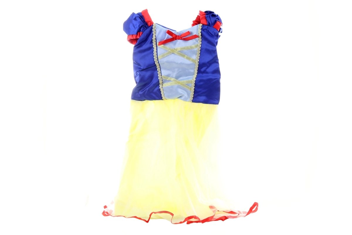 Proměňte svou holčičku v pohádkovou princeznu! Tyto šaty ve stylu Sněhurky zaujmou modrým živůtkem s ozdobným šněrováním a dlouhou žlutou sukní s červeným lemem. Skvěle se hodí na karneval, dětské oslavy i domácí hraní rolí.