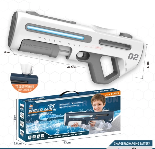 Užijte si osvěžující letní zábavu s touto elektrickou vodní pistolí v bílé barvě. Nabízí podsvícení pro večerní hraní, napájení akumulátorem 7,4 V i možnost manuálního použití bez napájení. Vyrobena z kvalitních materiálů a vhodná pro děti od 3 let.