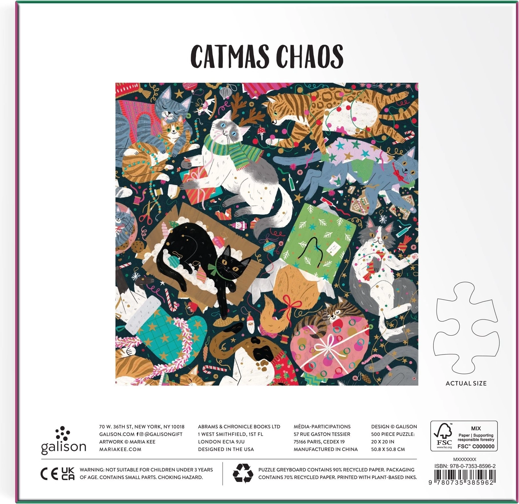 Užijte si zábavné skládání s elegantními metalickými efekty: čtvercové puzzle s motivem kočičího vánočního chaosu nabízí 500 dílků, kvalitní zpracování a předlohu motivu v balení. Výsledný obraz má rozměr 50,8 × 50,8 cm a skvěle se hodí jako dekorace či dárek pro milovníky koček a Vánoc.