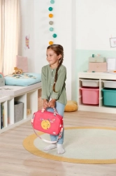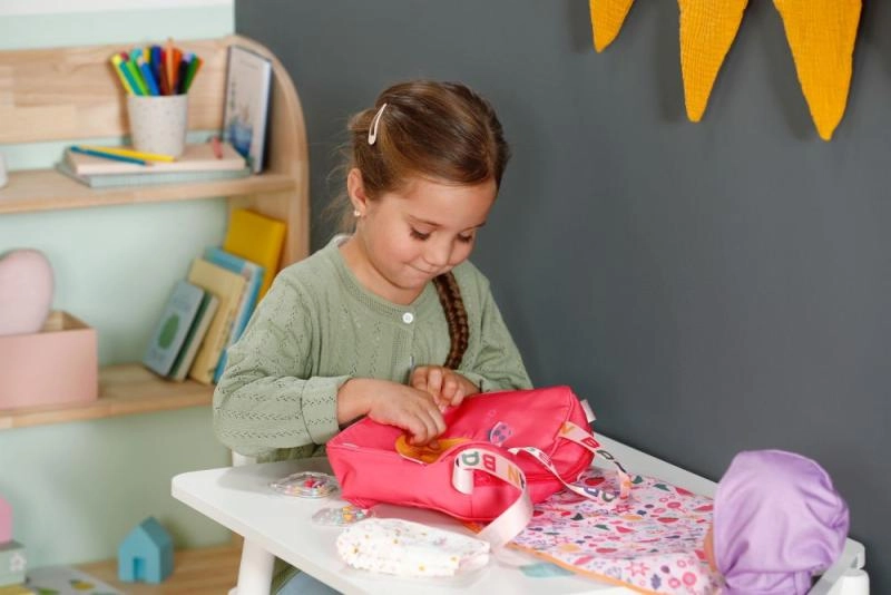 Díky nacvakávacím ozdobám si děti tašku přizpůsobí podle své nálady – podpoří tak kreativitu, jemnou motoriku a péči o druhé. Set zahrnuje skládací přebalovací podložku pro pohodlné přebalování kdekoli, plenku a drobné doplňky jako dózu na pudr a krabičku na nezbytnosti.