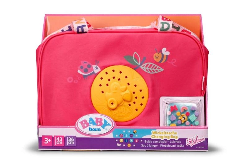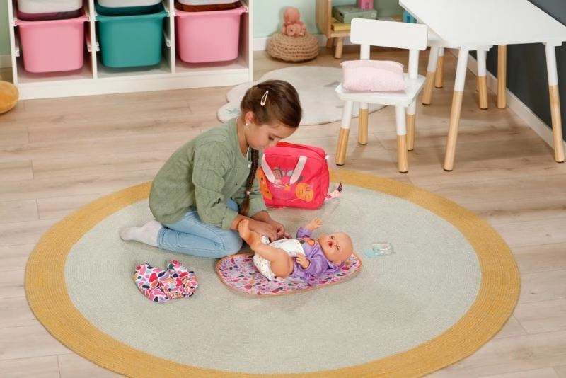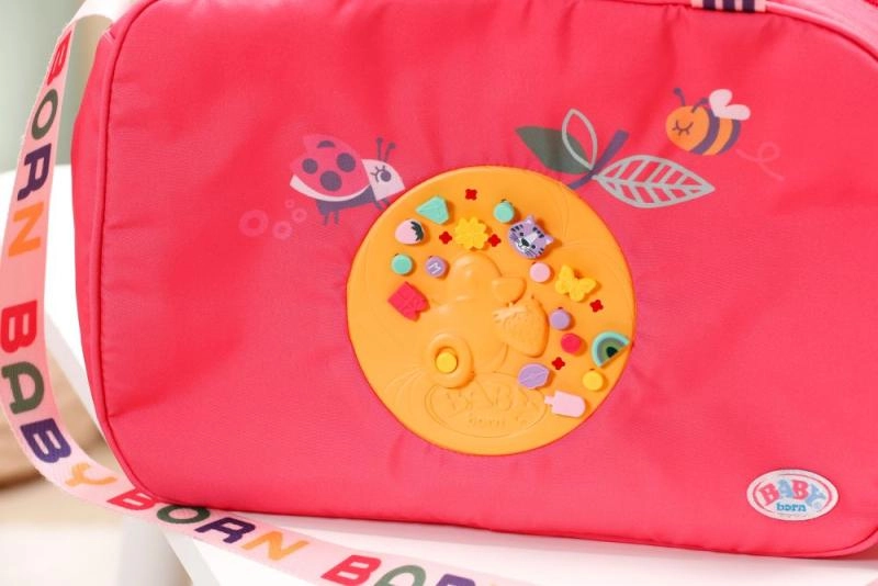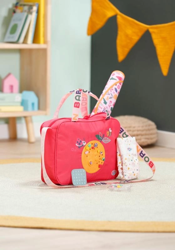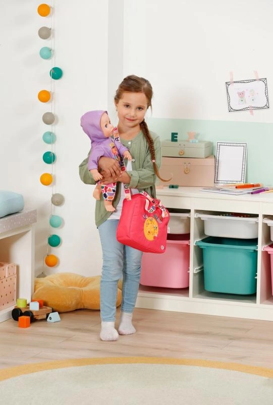 Přebalovací taška BABY born je lehká, pevná a navržená tak, aby udržela všechny nezbytnosti pro péči o panenku přehledně po ruce. Taška má zip, praktické kapsy a pohodlný popruh přes rameno. Barevné motivy a hravé detaily dělají z každé procházky stylové dobrodružství.