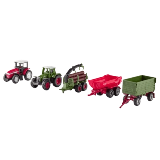 Tato všestranná sada Siku Farmer přináší autentický zážitek ze světa zemědělské techniky. Najdete v ní traktor MASSEY FERGUSON 9240, traktor FENDT FAVORIT 926, lesní přívěs s otočným a výkyvným nakládacím jeřábem, červený sklápěč KRAMPE a dvounápravový přívěs. Precizní provedení a funkční detaily podporují kreativní hru a rozvoj motoriky.