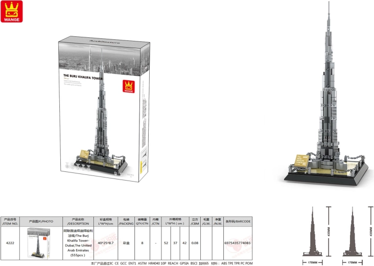 Tato detailní stavebnice z edice „budovy“ umožňuje postavit stylový model nejznámějšího mrakodrapu Dubaje – BURJ KHALIFA. Díky promyšleným dílkům a obrazovému návodu je skládání zábavné a přehledné, a výsledný model vynikne na poličce i pracovním stole.