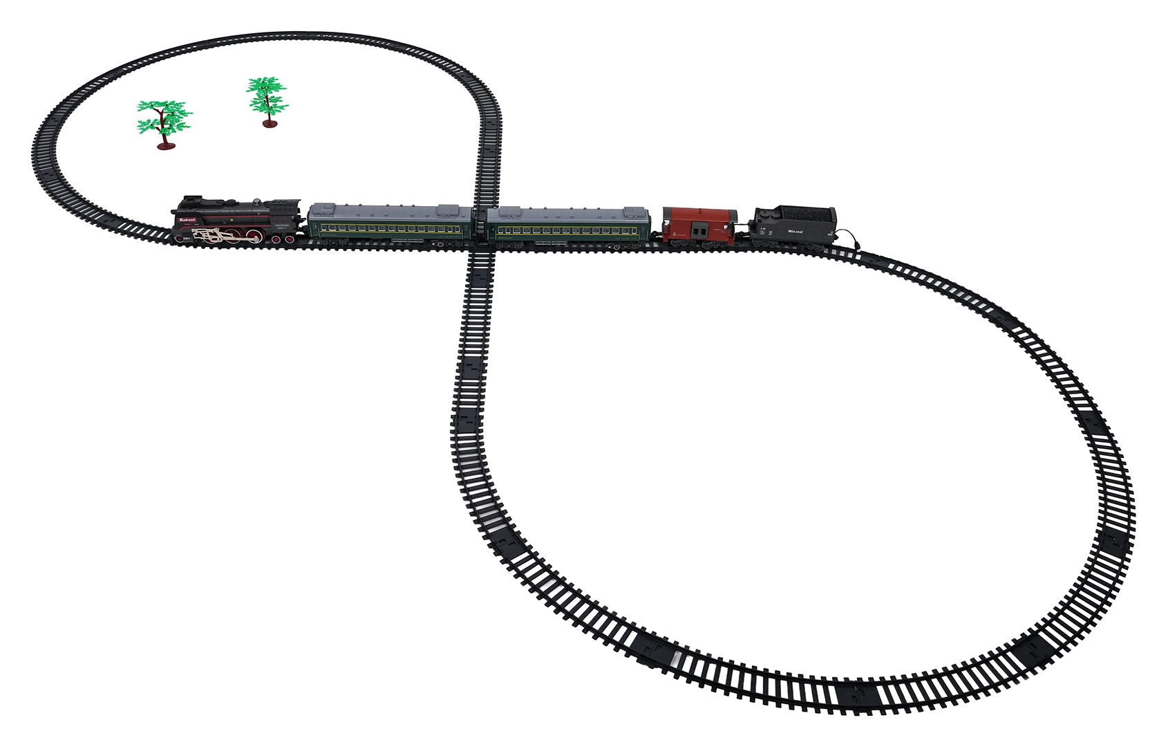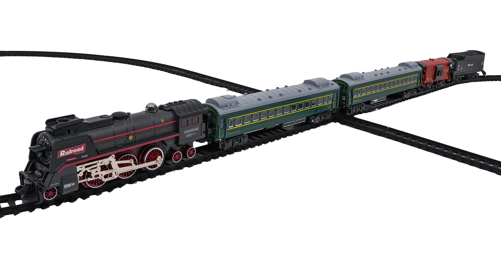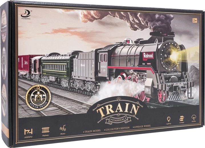 Sada obsahuje lokomotivu, 2 osobní vozy, vůz s uhlím a nákladní/zvířecí vůz, které dohromady tvoří působivou soupravu. Odolné plastové koleje se rychle sestavují do velkého okruhu o rozměru přibližně 216 × 92,5 cm. Pro klidnější hraní lze zvuky lokomotivy vypnout.