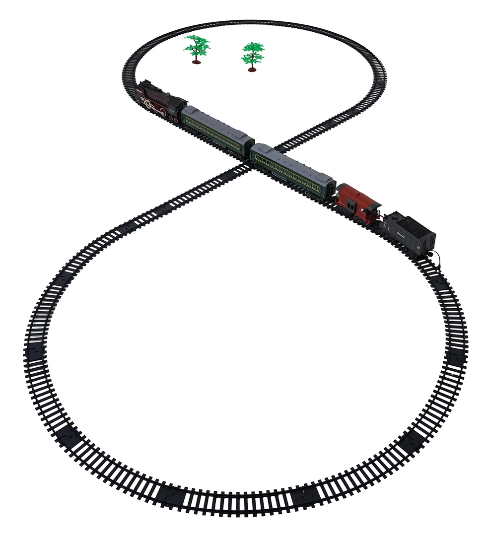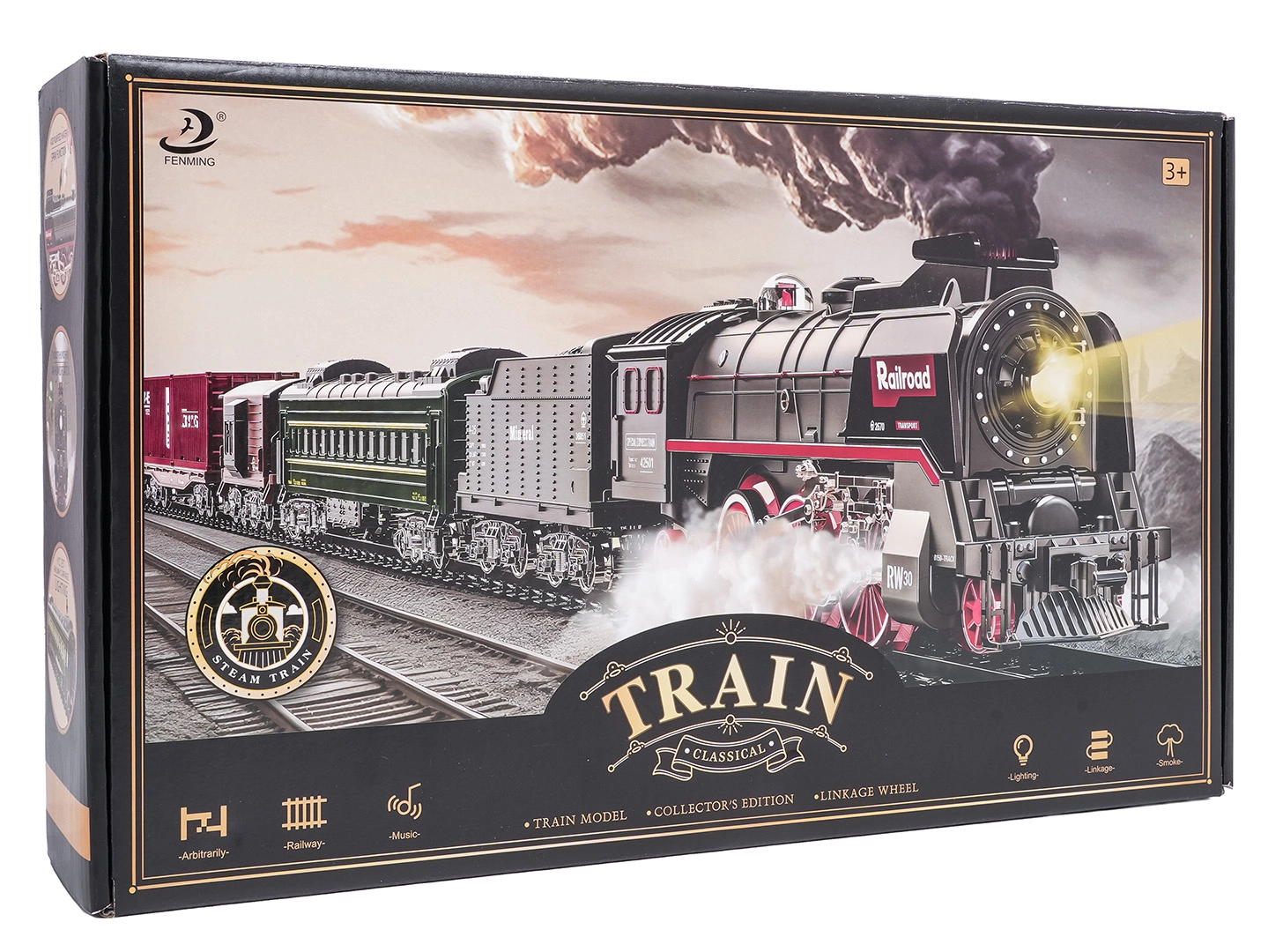 Stylový retro vláček pro děti od 3 let přináší autentický zážitek s kouřem z komína, světlem reflektoru a realistickými zvuky jízdy. Souprava je poháněna akumulátorem 3,7 V (součástí balení), koleje jsou pevné a bezpečné a snadno se spojují do velkého okruhu o délce 216 cm.