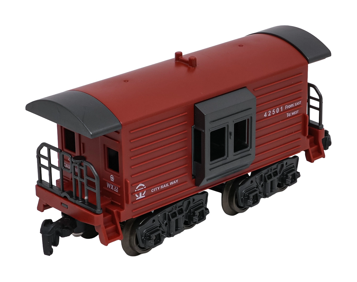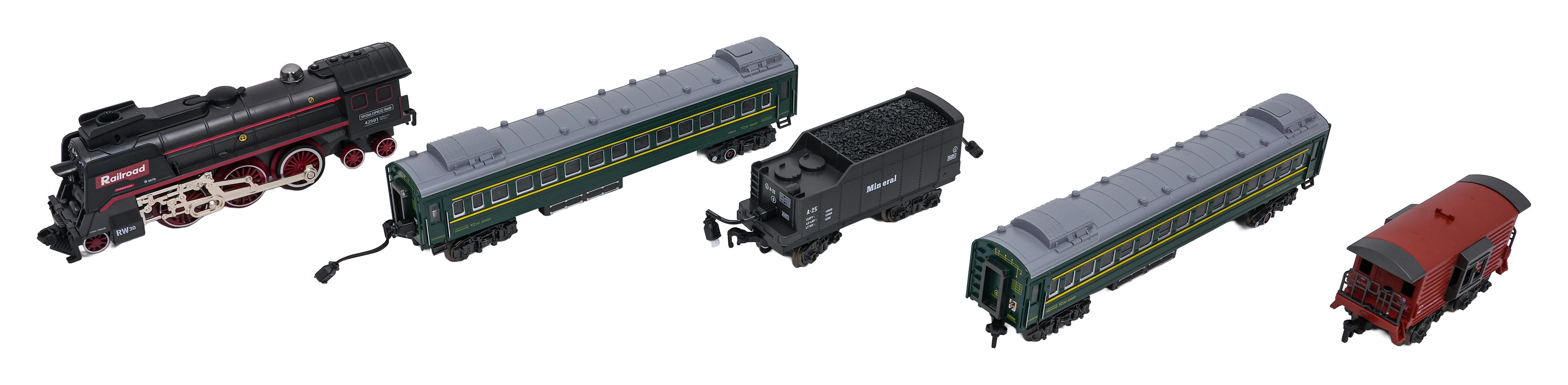 - lokomotiva, 2× osobní vůz, vůz s uhlím (tendr), nákladní/zvířecí vůz, díly kolejí, USB nabíjecí kabel, šroubovák, pipeta na vodu