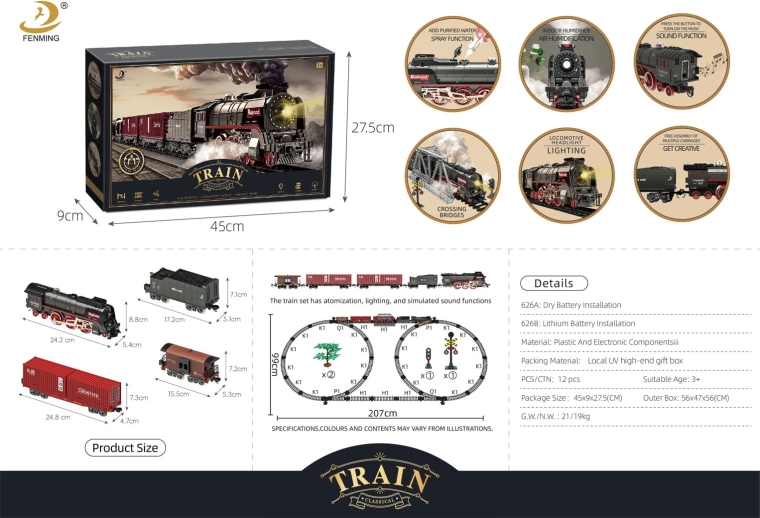 Stylový retro vláček potěší malé i velké milovníky železnice. Nabízí realistický kouř z komína, světelný reflektor a zvuky jízdy. Díky snadno spojovatelným, odolným kolejím a dobíjecí baterii 3,7 V 1200 mAh je zábava připravena během chvilky. Vhodné pro děti od 3 let, s možností vypnutí zvuků pro tichou jízdu.