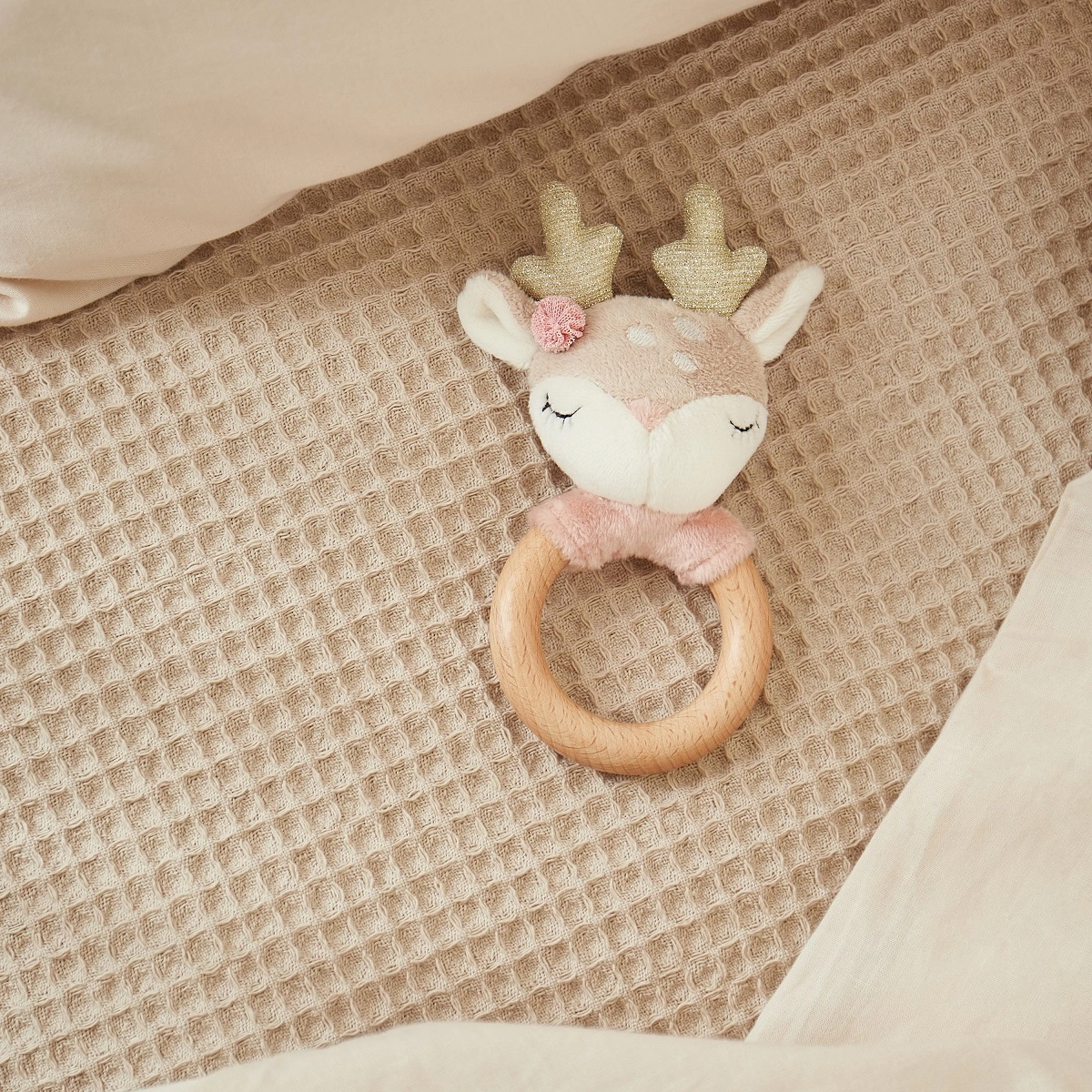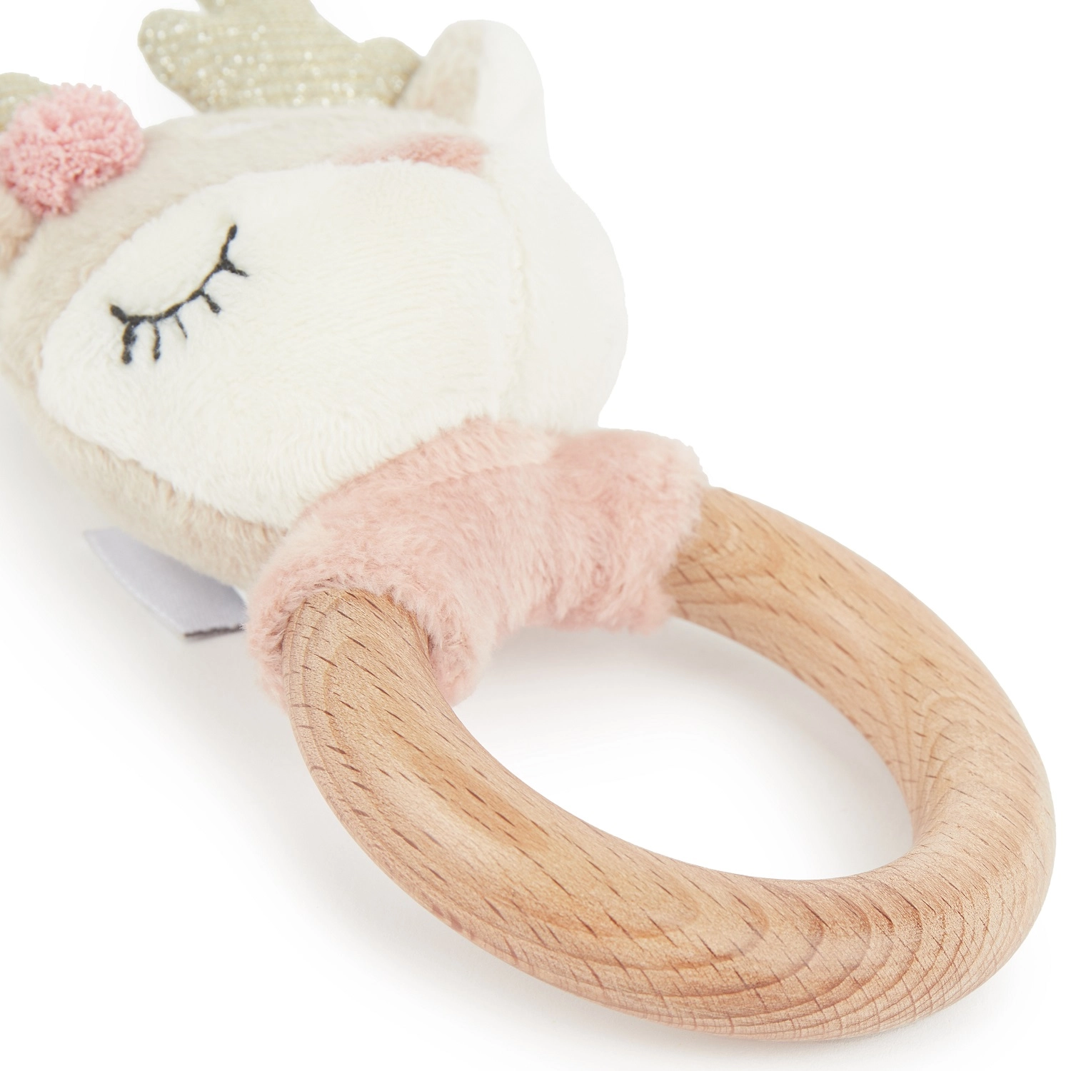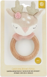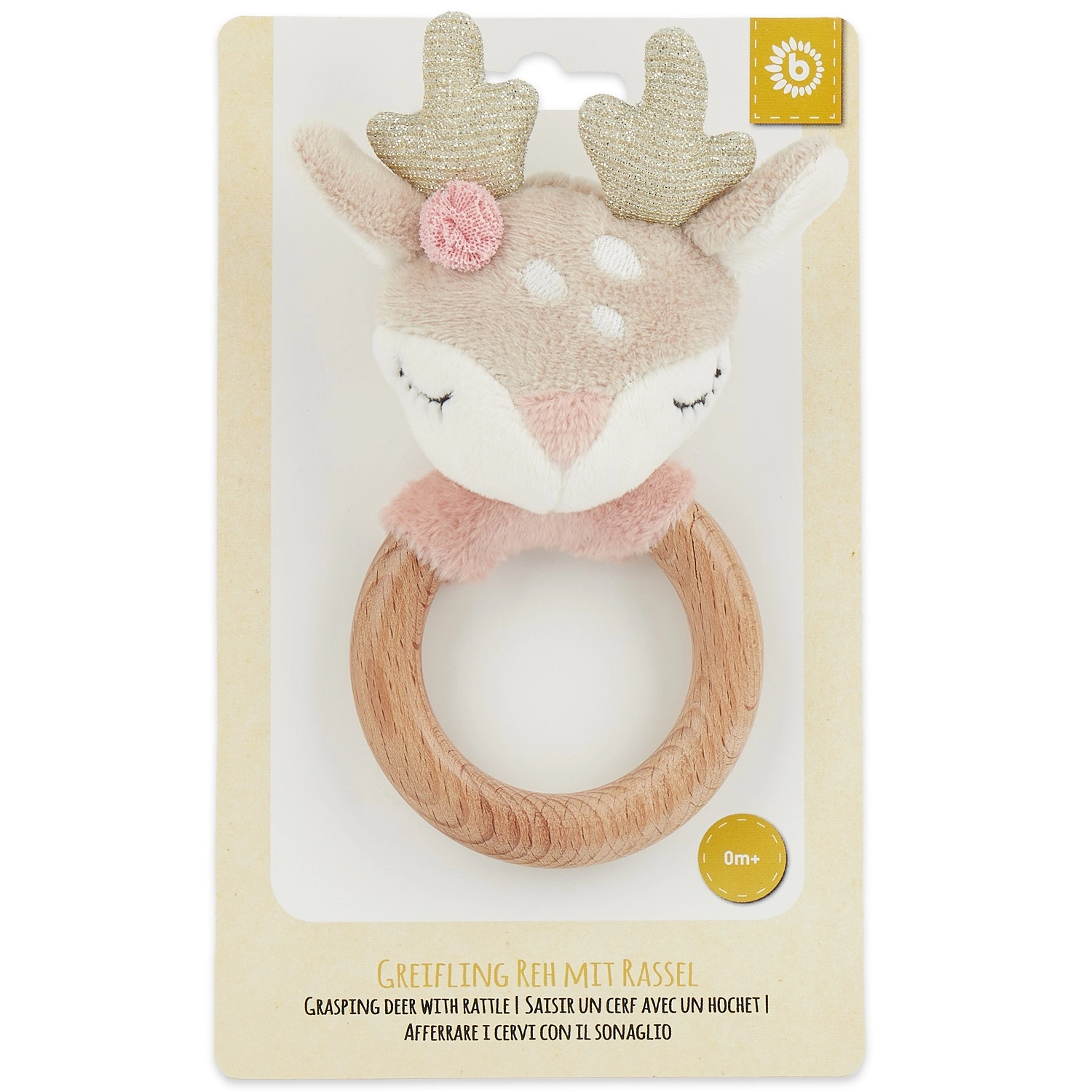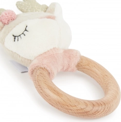 Tato multifunkční motorická hračka spojuje tři oblíbené funkce – chrastítko, uchopovací hračku a kousátko. Dřevěný kroužek je hladký, příjemný do ručky a vhodný ke kousání, zatímco hebká plyšová hlavička kolouška nabízí uklidňující dotykový vjem. Jemné chrastění přirozeně podněcuje zvědavost a rozvíjí koordinaci oko–ruka.