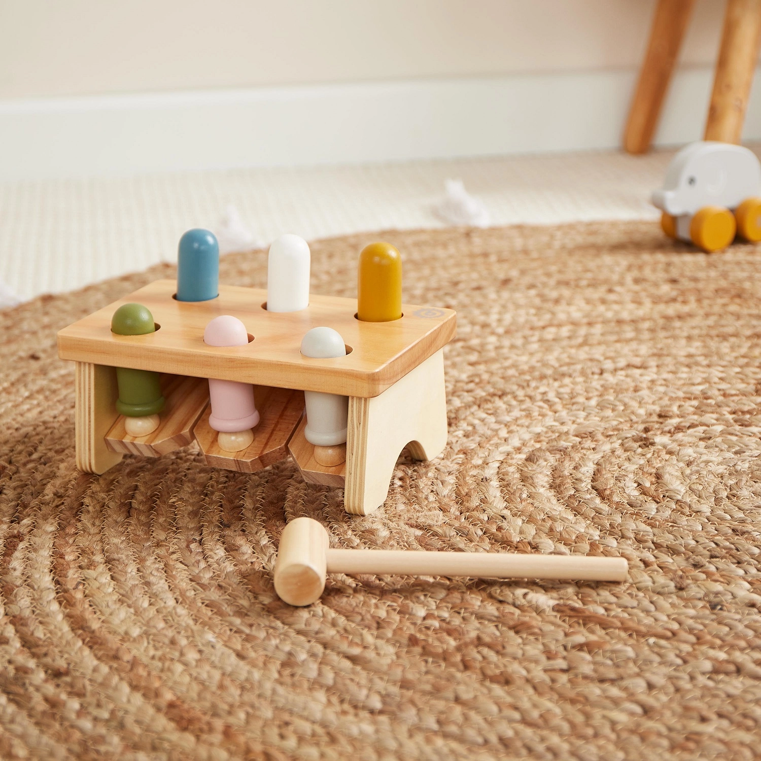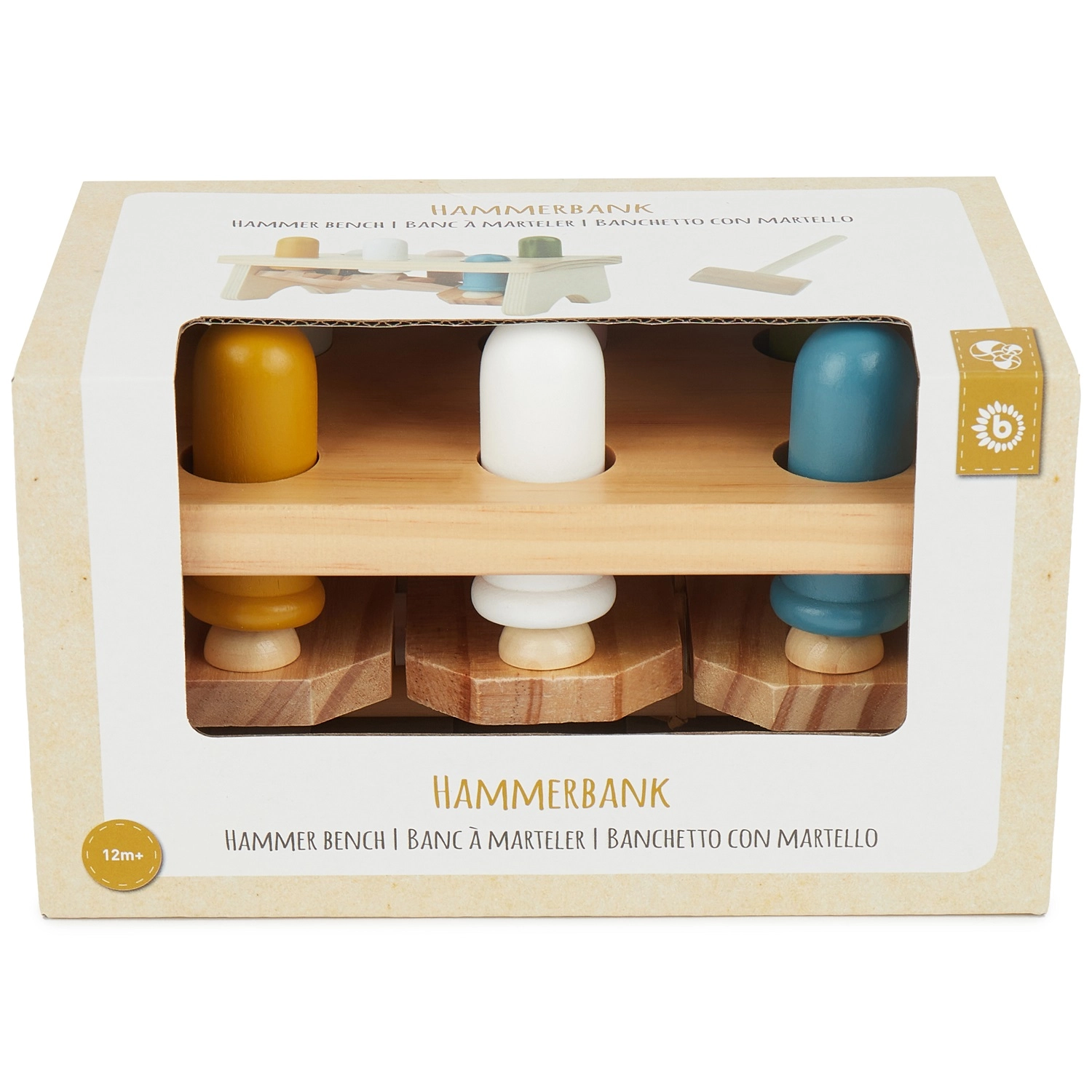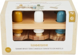 Dřevěná zatloukačka s kladívkem ve tvaru lavice přináší dětem nekonečnou zábavu i učení. Při zatloukání barevných kolíků se některé prvky pohybují v opačných směrech, což dětem názorně ukazuje, jak funguje příčina a následek. Díky robustnímu provedení a hladce broušeným hranám je hra bezpečná a příjemná na dotek.