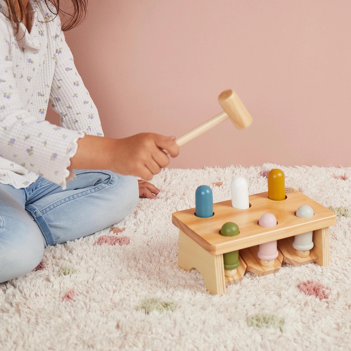 Zatloukání kolíků kladívkem podporuje přesný úchop, koordinaci oko–ruka a soustředění – ideální pro první motorické hry.