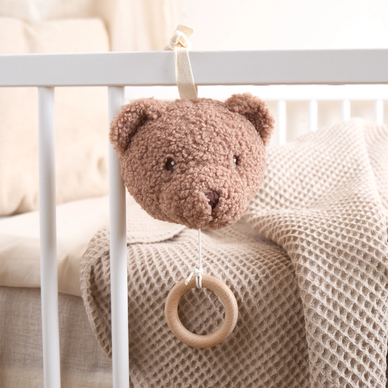 Medvídek Mika je něžná závěsná hračka s hudebním strojkem, která pomáhá vytvořit klidný rytmus večerního rituálu. Stačí zatáhnout za hladký dřevěný kroužek a zazní známá Brahmsova ukolébavka „Dobrý večer, dobrou noc“. Díky měkkému, strukturovanému plyši a vyšívaným detailům je hračka bezpečná a příjemná i pro nejmenší.