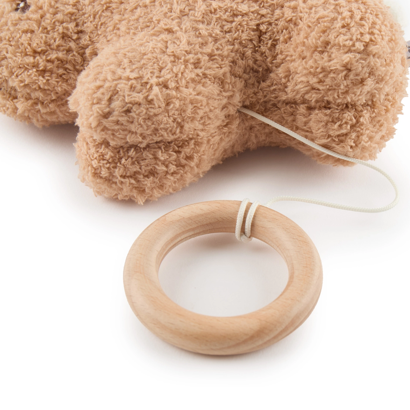 Příjemný plyš a dřevěný kroužek pro malé ručky