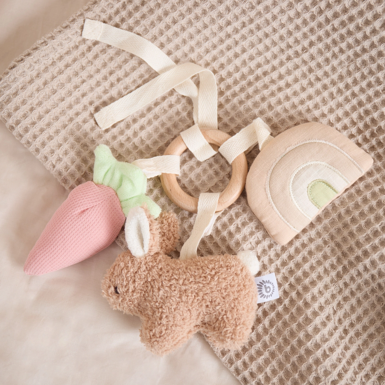 - Dřevěný kroužek, duha se zrcátkem, mrkev s vrzátkem a praskající fólií, králík s chrastítkem a šustící fólií