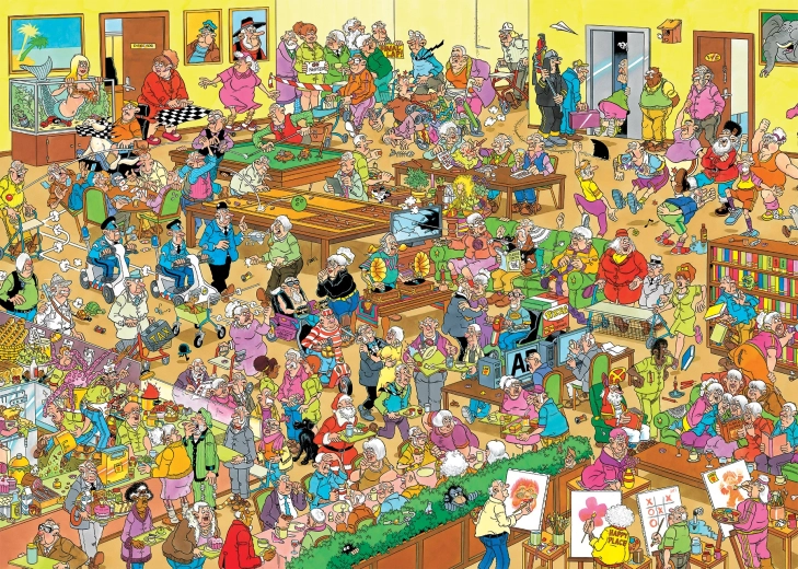 Objevujte jeden vtip za druhým v originální ilustraci „Domov důchodců“ od autora Jan van Haasteren, vytvořené exkluzivně pro značku JUMBO. Typický styl plný humoru, množství postav a nečekaných situací vás vtáhne a nepustí.