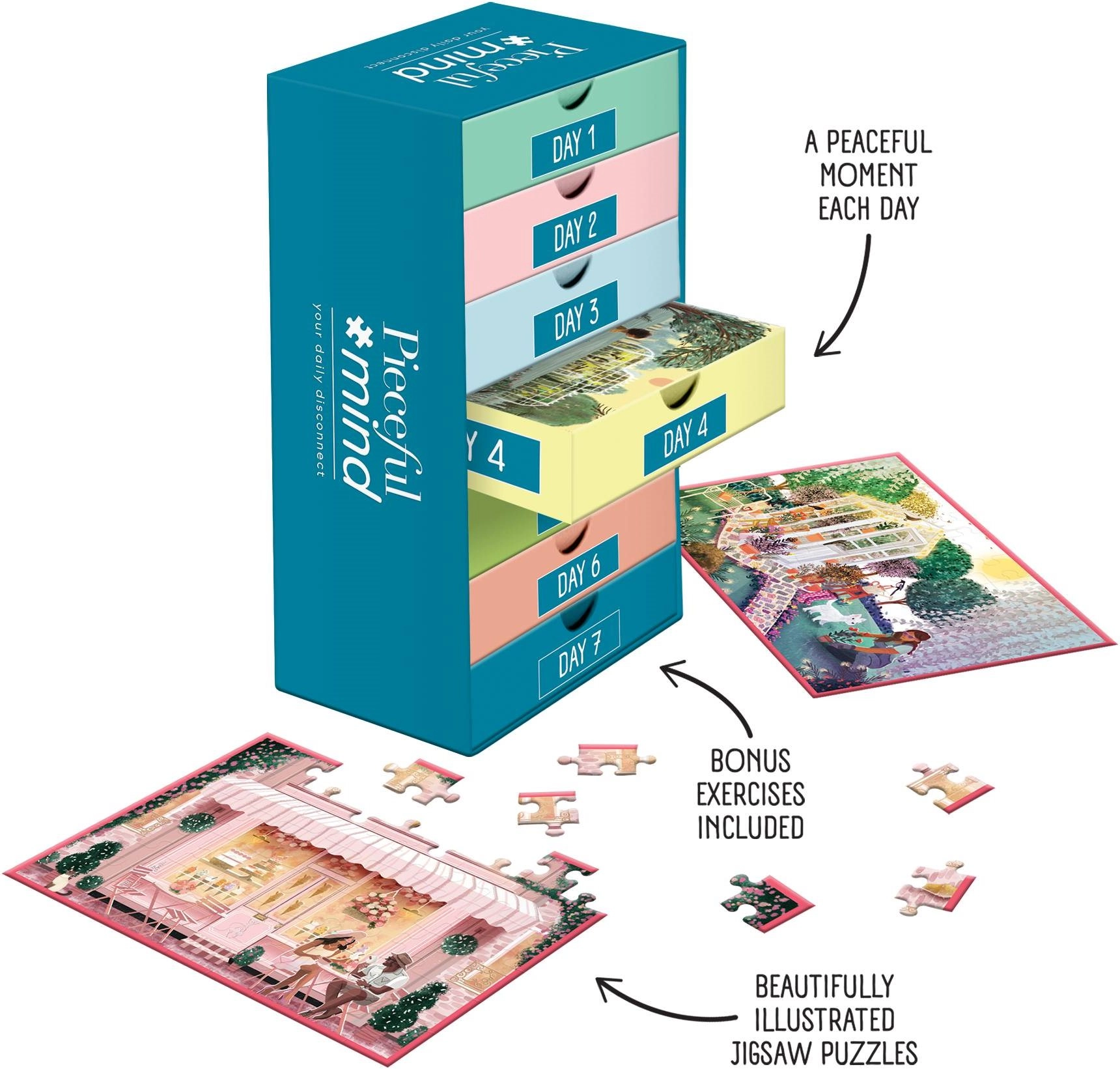 Set JUMBO Pieceful Mind přináší 6 samostatných puzzle po 54 dílcích, navržených tak, aby uklidnily mysl a inspirovaly k pravidelnému odpočinku. Každé mini puzzle má kompaktní rozměry, takže se skvěle hodí pro krátké denní chvilky klidu.