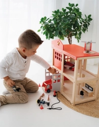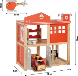 Proměňte dětský pokoj v akční záchranářské centrum! Tato robustní dřevěná hasičská stanice má dvě patra, přistávací plochu s vrtulníkem a požární tyč. Součástí jsou i ohebné figurky, hasičské auto a bohaté příslušenství. O opravdovou atmosféru se postará světelný a zvukový modul se sirénou, funkční naviják vrtulníku a otevřený design pro snadný přístup. Hračka rozvíjí jemnou motoriku, představivost i sociální dovednosti.