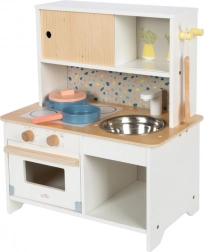 Kompaktní dětská kuchyňka v moderním skandinávském stylu s barevným vzorem terrazzo přináší realistickou hru na vaření v každém dětském pokoji. Nabízí otočné knoflíky s cvakavým zvukem, troubu s magnetickými dvířky, kovový vyjímatelný dřez a příslušenství včetně pánve, hrnce s poklicí a dřevěné vařečky. Díky pracovní výšce 22 cm je ideální pro malé ruce i jako kuchyňka pro panenky (cca 43 cm).