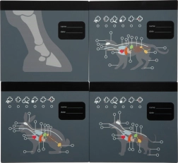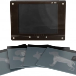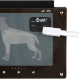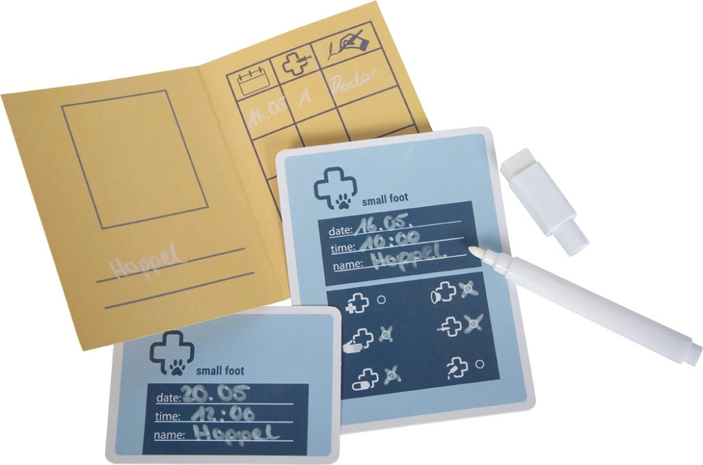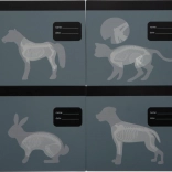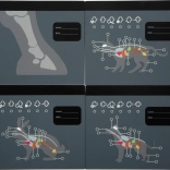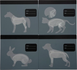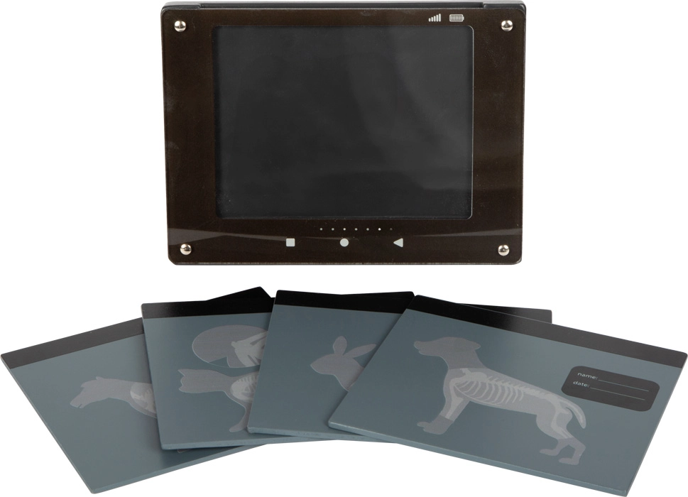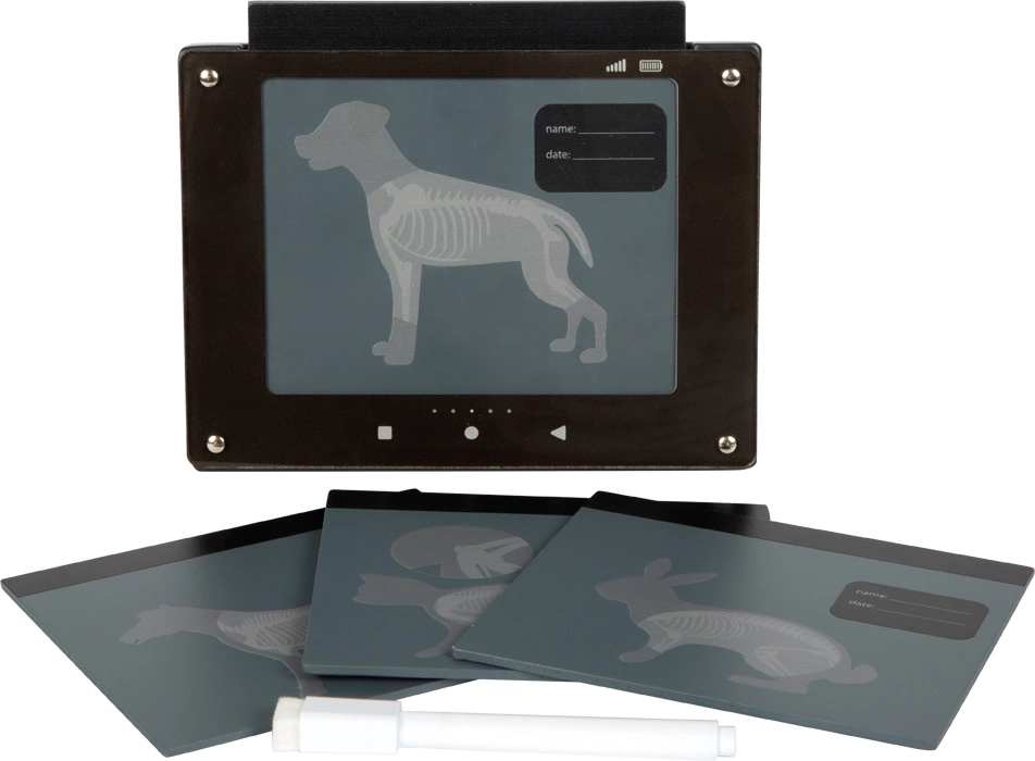 Interaktivní „rentgen“ s průhlednými kartami zvířat (pes, kočka, králík, kůň) podporuje představivost a vysvětluje stavbu těla hravou formou. Zapisovací pole umožní jméno pacienta a datum vyšetření.