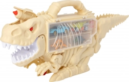 Zábavný set pro malé závodníky: střílející dinosaurus s autíčky o délce 47 cm slouží jako přenosný kufřík, organizér na autíčka a zároveň akční dráha s vystřelováním. Obsahuje 2 auta a 2 figurky dinosaurů, má otevírací bok s přihrádkami, zvedací ocas jako dráhu a raketový střelec s tlačítkem pro extra akci.
