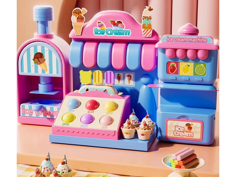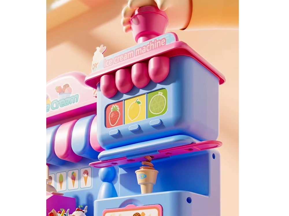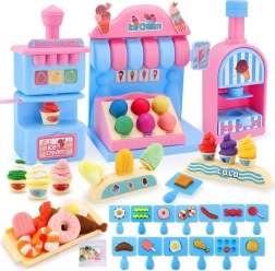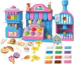 Komplexní herní set zahrnuje stroj na zmrzlinu pro vytlačování barevných porcí, prodejní pult pro vystavení dobrot a lis s „pečicí“ formou pro tvarování koláčků a sušenek. Vše je laděno do jemných odstínů růžové a modré, aby výtvory vypadaly jako z opravdové vitríny cukrárny.
