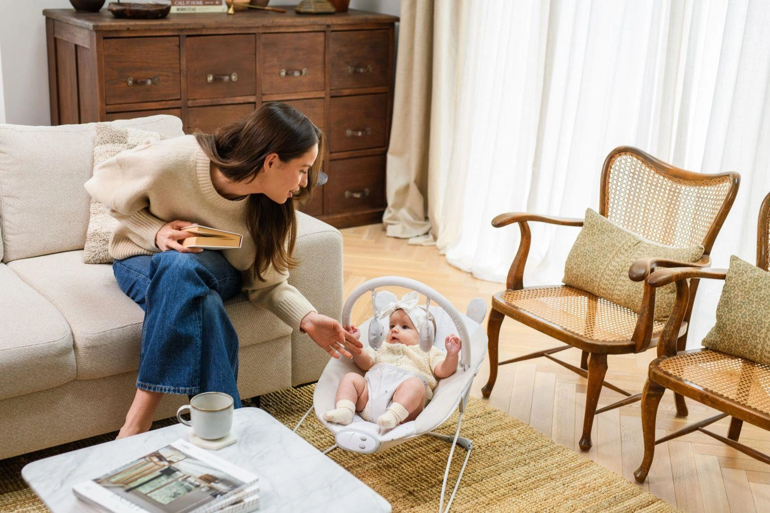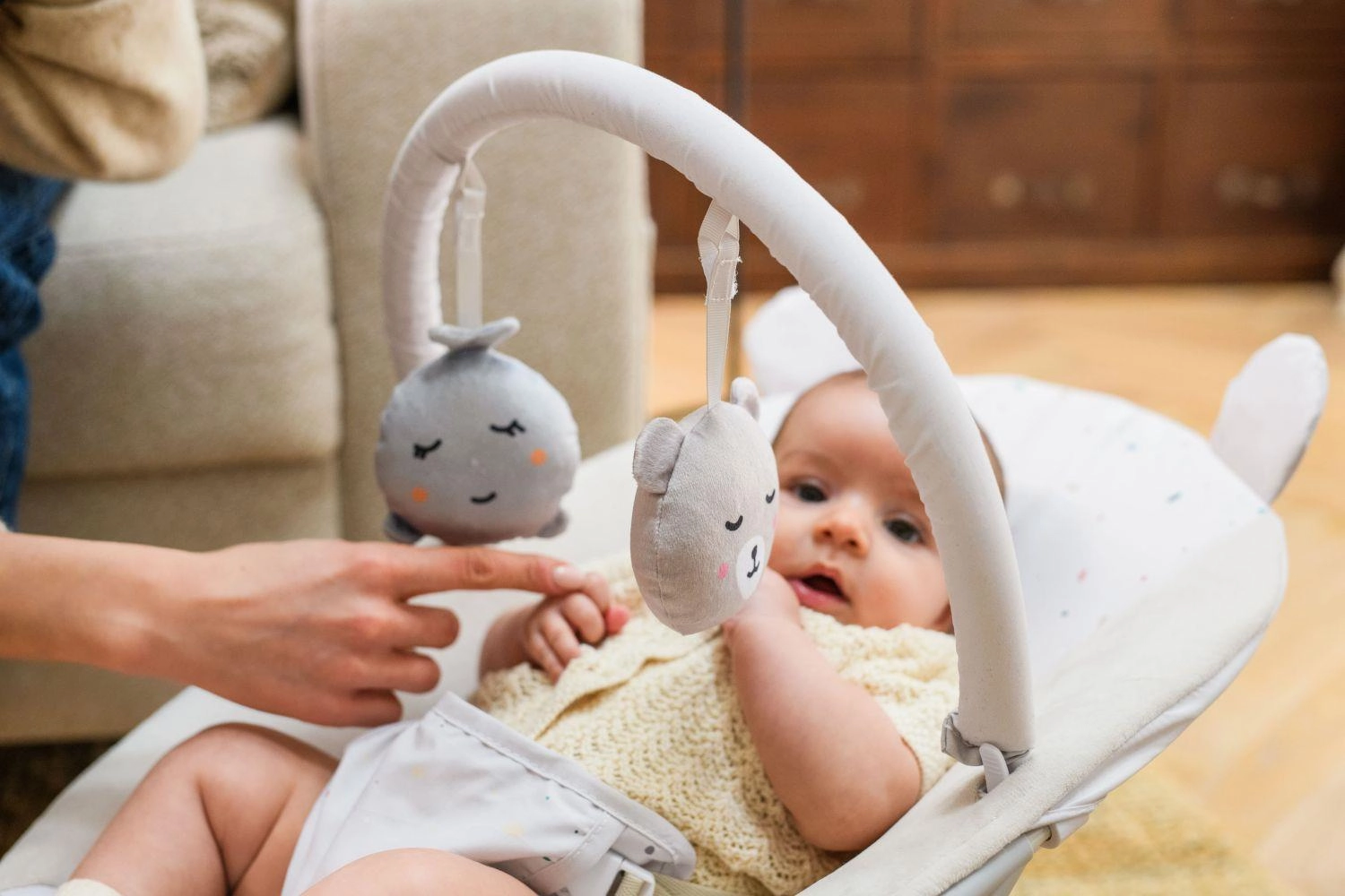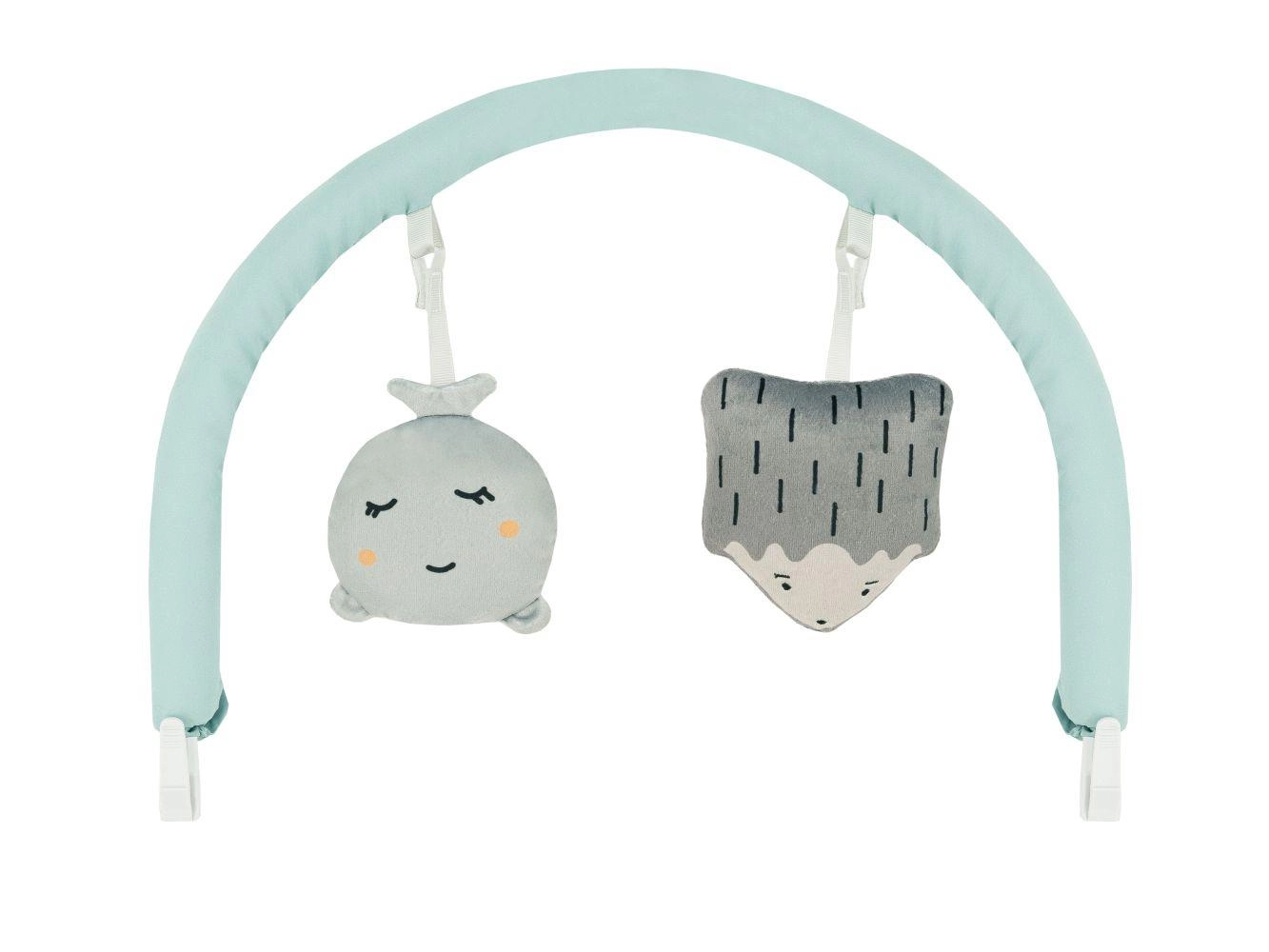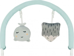 Odnímatelná hrazdička se dvěma měkkými hračkami podporuje vizuální sledování, úchop a koordinaci ruka–oko.