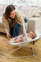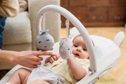 Odnímatelná hrazdička se dvěma senzorickými hračkami podporuje rozvoj zraku i hmatu, zatímco 3bodový pás a stabilní nohy s protiskluzovými koncovkami dbají na bezpečí. Potah snadno sundáte a vyperete v pračce – lehátko tak zůstává čisté a připravené pro každodenní použití.