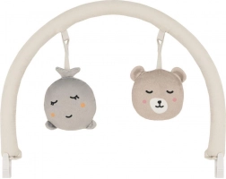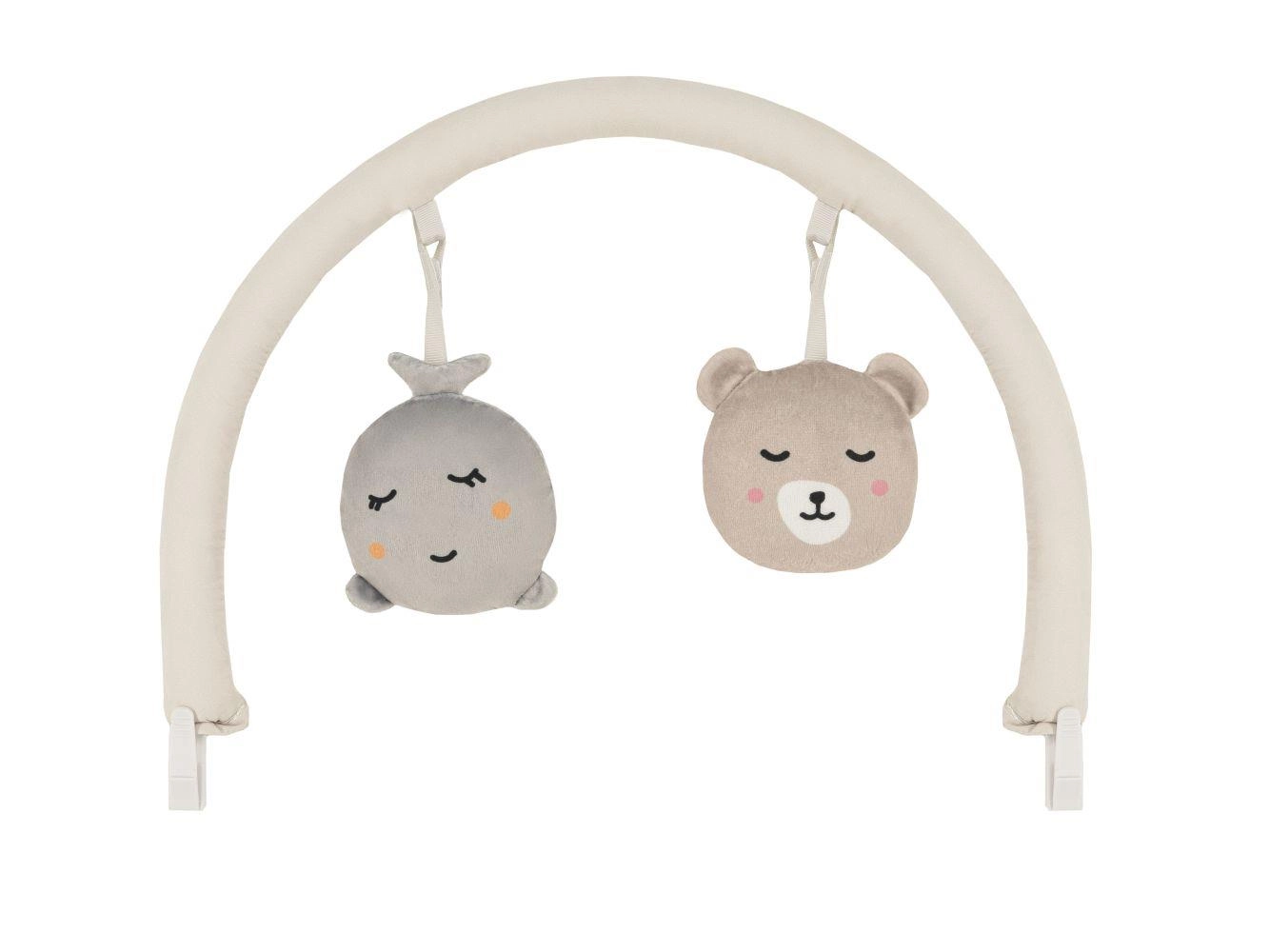 Odnímatelná hrazdička se dvěma měkkými hračkami podněcuje zrak, hmat i koordinaci rukou a očí.
