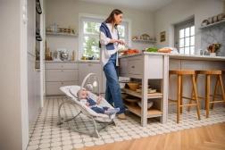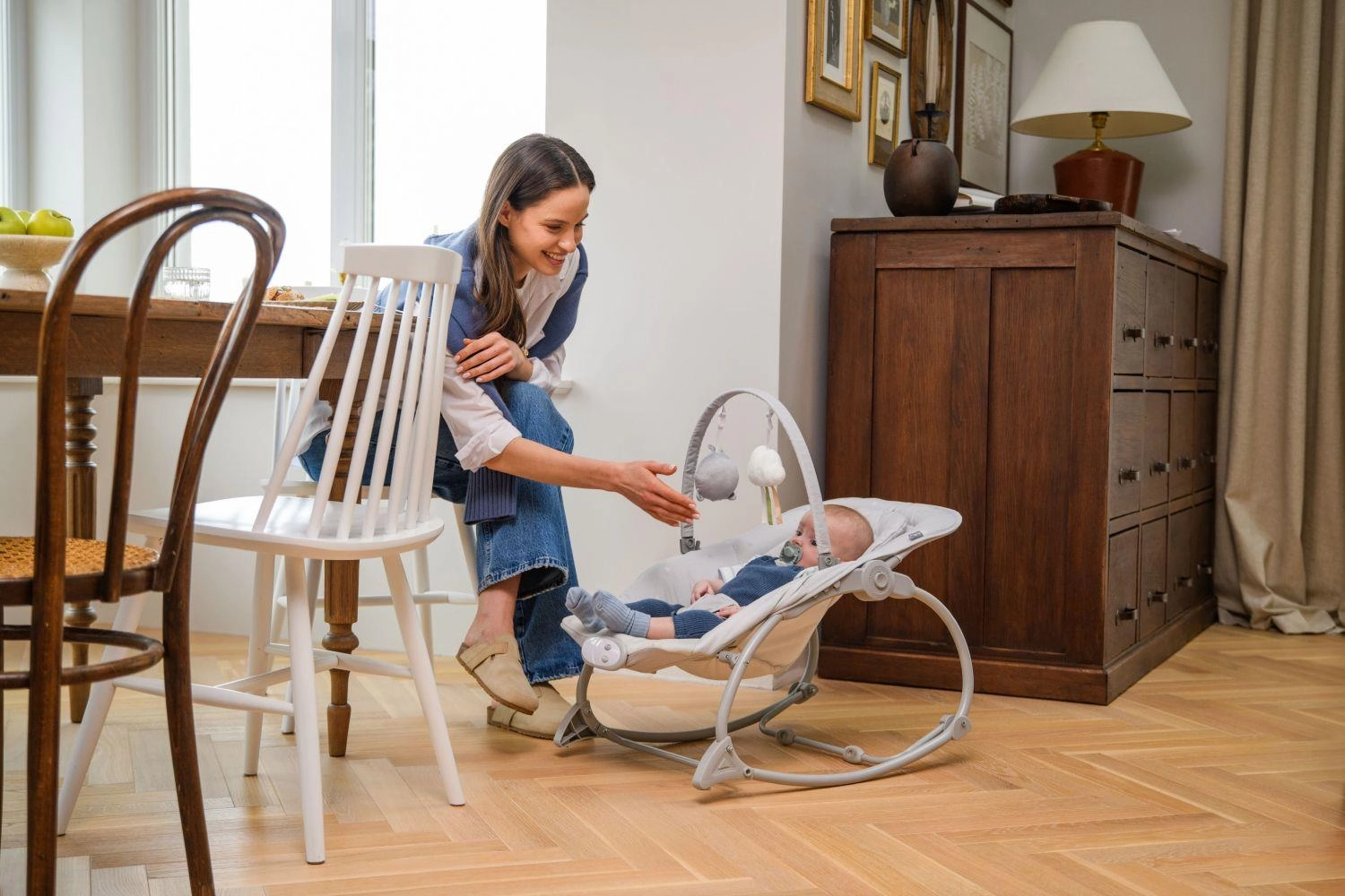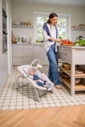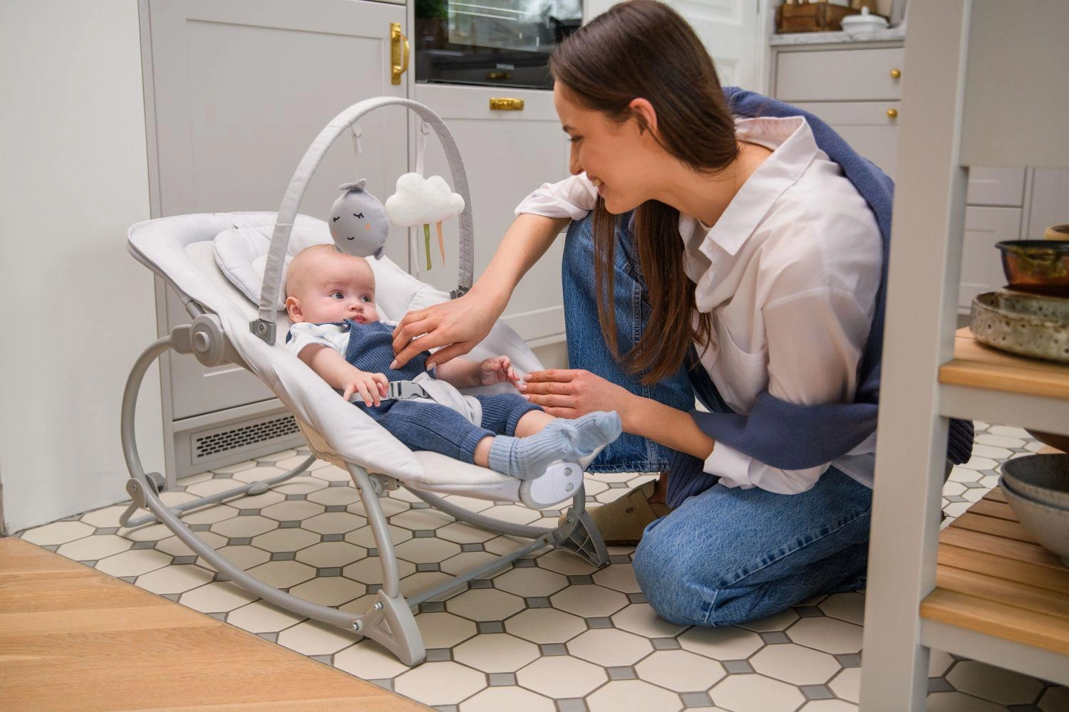 Pro bezpečí slouží 3bodový bezpečnostní pás a široký rozkrokový popruh, stabilní rám umožňuje i aretaci houpání. Praktické snímatelné a pratelné potahy usnadní údržbu. Hrazdička se dvěma měkkými hračkami podporuje smyslový rozvoj a zabaví miminko, když potřebujete mít volné ruce.