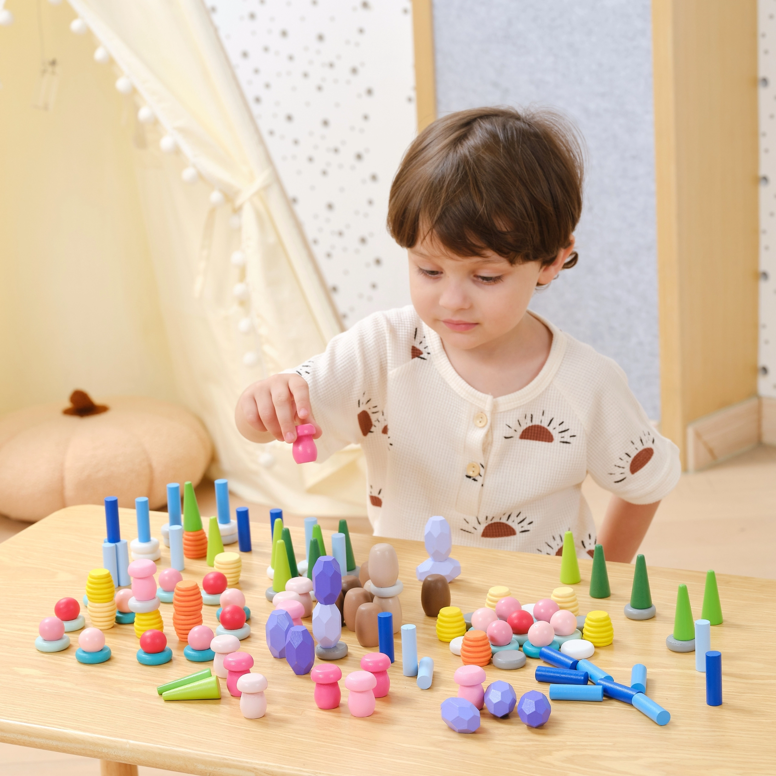 Hladké dřevěné tvary, prstýnky, kužely a „kamínky“ vybízejí k uchopování, navlékání a vyvažování, čímž podporují přesnost pohybů a koordinaci ruka‑oko.